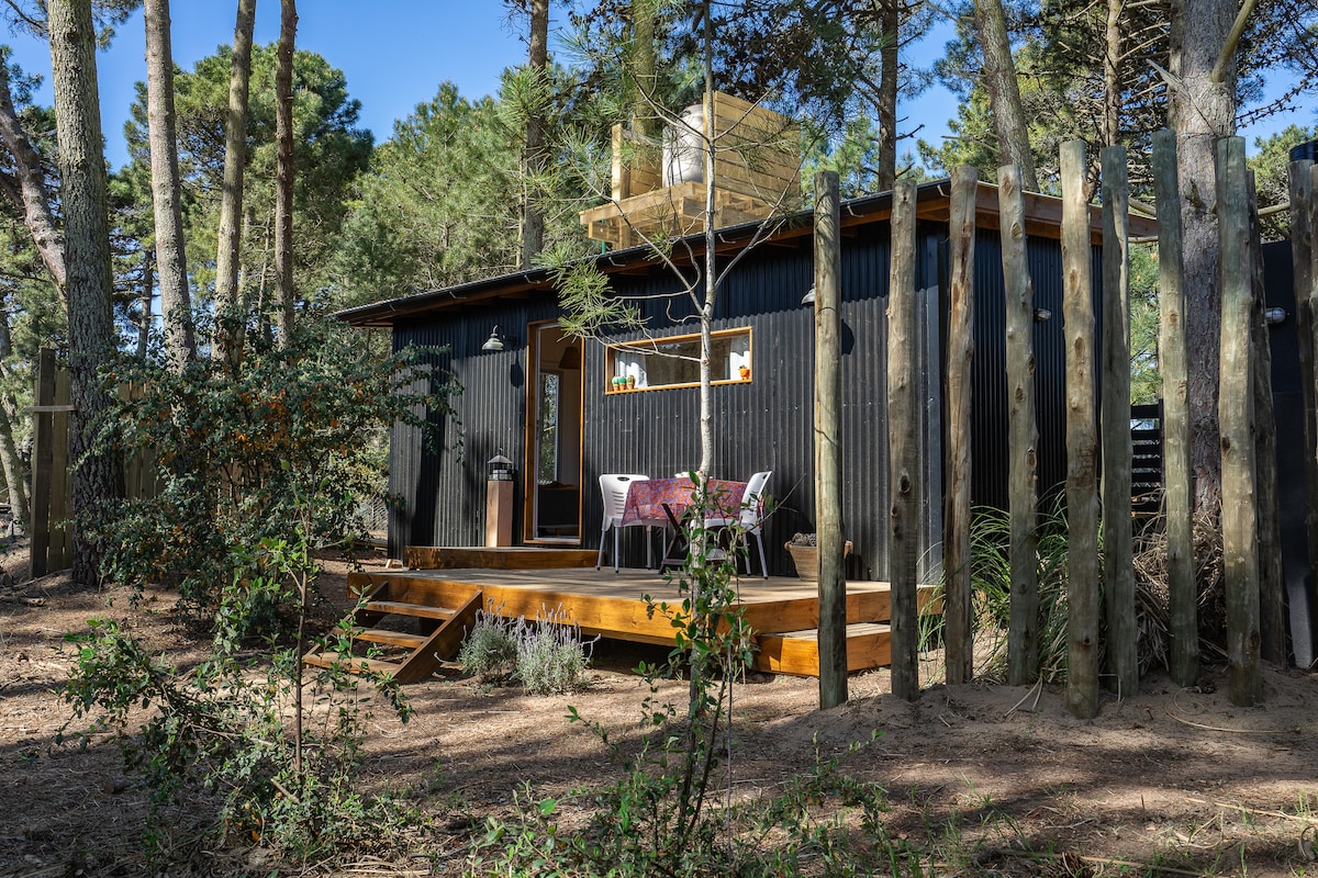 Pequeña y luminosa cabaña inmersa en el bosque. Un lugar ideal para parejas y una alternativa para personas solas que quieran descansar en silencio y despertar con el canto de los pájaros en un ambiente agreste y tranquilo. Cochera privada, tv, Wifi, alarma. Zona de parrilla exclusiva para huéspedes. Barrio residencial y familiar, alejada del bullicio de la temporada. Nos encontramos a 10 calles de la playa y a 15 del centro comercial. ATENCION: NO ACEPTAMOS CUATRICICLOS NI MOTOS.