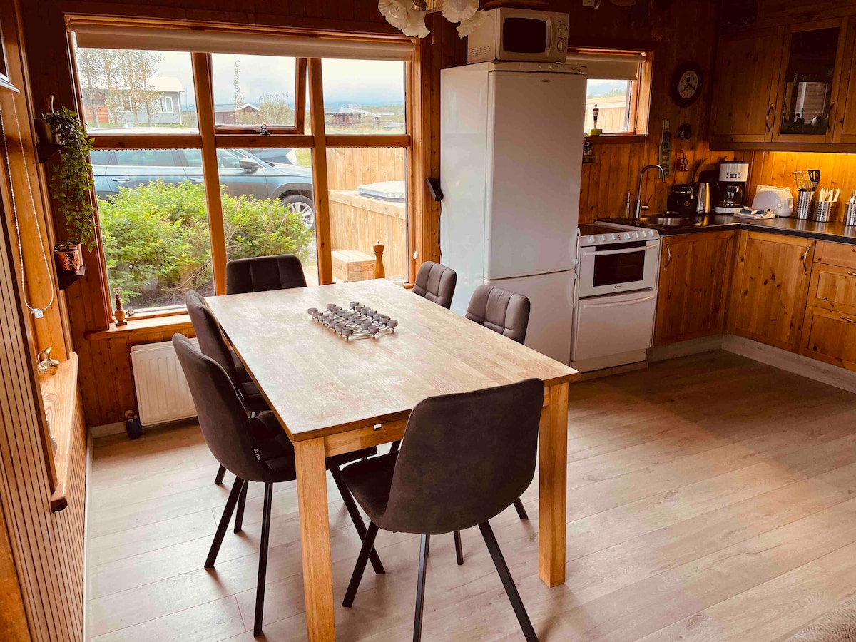 Այս հանգիստը շատ յուրահատուկ է և մեկուսի ։ Այն ունի տպավորիչ համայնապատկերային լեռնային տեսարան Իսլանդիայի երկու ամենահայտնի հրաբուխների և հյուսիսային լույսերի ֆանտաստիկ տեսարանների վրա: Տունը հարմարավետ է, ունի բազմաթիվ պատուհաններ ՝ տեսարանը վայելելու համար: 4 հոգու համար նախատեսված ննջասենյակ, հարմարավետ մահճակալ և շքեղ թախտ ։ Այս վայրն ունի շատ բնավորություն, իսկ պատերին ՝ իսլանդական արվեստի գործեր, ինչպես նաև հզոր wi - fi և խելացի հեռուստացույց ։ Լվացքի առանձին սենյակ ՝ լվացքի մեքենայով և չորանոցով ։