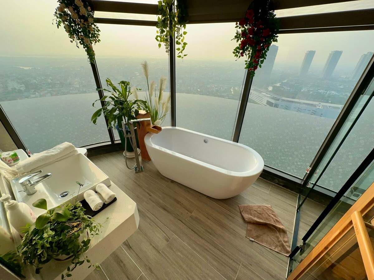 Relax in this cozy yet luxurious Ecopark apartment with ensuite bathtub, private sauna, and a complimentary mini bar. Kitchen includes air fryer, microwave, full kitchen - including cookware and filtered water system, plus washer & dryer. Free gym. The pool, and onsen are accessible with fees await in lush green surroundings. Just 30 mins to Hanoi old quarter with hourly bus service. Monthly guests enjoy extra complimentary perks for even more value.