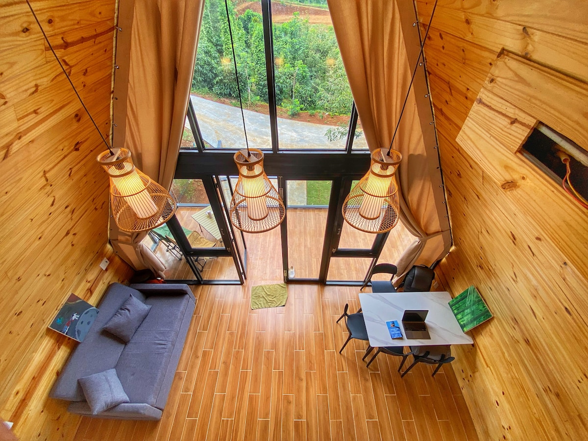 Ռոմանտիկ փայտե տուն ՝ 2 ննջասենյակով, 2 լոգասենյակով և խոհանոցային ամբողջական պարագաներով ։ Մուտք դեպի 2 - րդ հարկ ՝ նստատեղով, որպեսզի դիտեք սոճու անտառը ՝ հազարավոր սուրճի այգիների հետևում ։ Ահա թե որտեղ եք ուզում ծանոթանալ ամպերի, ցողի, արևի ճառագայթների, սոճու և լեռնային քամիների հետ ։ Այստեղ կլիման ամբողջ տարվա ընթացքում 17 -19 աստիճան է, այն իդեալական վայր է սոճու անտառի և բնական ջրի աղբյուրի մեջ ընկղմվելու համար: Տեսարժան վայրեր ՝ Սպիտակ դղյակ -9 կմ Հանգստի գոտի, TDTT -15 կմ Բատ Նհա -8 կմ վանք Բենզին -7 կմ Լա Վանգ տաճար -9 կմ