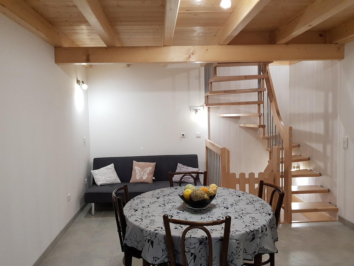 26 մ2 մակերեսով անկախ ստուդիա ՝ առանձին ննջասենյակով, առանձնացված տանը ՝ անտառի եզրին գտնվող հարավում գտնվող կտուրով ։ Խոհանոցն ու հատակն ամբողջությամբ վերակառուցվել են2023 թվականի ապրիլին ։ 2 հոգու համար ՝ լիովին կահավորված (140 մահճակալ, լվացքի մեքենա, ամանալվաց մեքենա, սառնարանի խցիկով սառնարան, միկրոալիքային վառարան, ինդուկցիոն սալօջախներ, Nespresso, Dyson փոշեկուլ, տոստեր, թեյնիկ, հեռուստացույց, Wi - Fi) Հեծանվային արահետից 300 մետր հեռավորության վրա, Անսի լճից 2 կմ հեռավորության վրա, պարապլանով թռչող բազայից և գյուղի կենտրոնից 800 մետր հեռավորության վրա