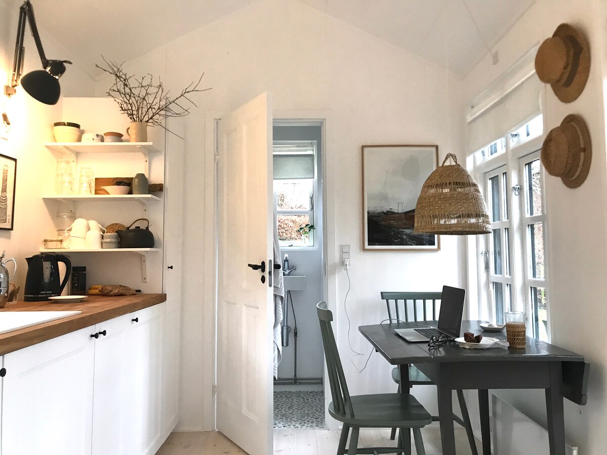 Մեր գեղեցիկ պարտեզի վերջում գտնվում է մեր հարմարավետ կցաշենքը, որը ձեր տրամադրության տակ է: Քոթեջը նոր է վերանորոգվել հմայիչ և հարմարավետ ոճով: Կա փոքրիկ խոհանոցիկ, որտեղ հնարավոր է պատրաստել նախաճաշ: Եթե ցանկանում եք տաք սնունդ պատրաստել, խնդրում ենք ընտրել մեկ այլ AirBnB: Օթևանատունը գտնվում է անտառի և լողափի մոտակայքում: Օթևանն գտնվում է քաղաքի կենտրոնից 1 կմ հեռավորության վրա և 1,5 կմ հեռավորության վրա սննդի շուկայից, կայարանից և Քրոնբորգից: