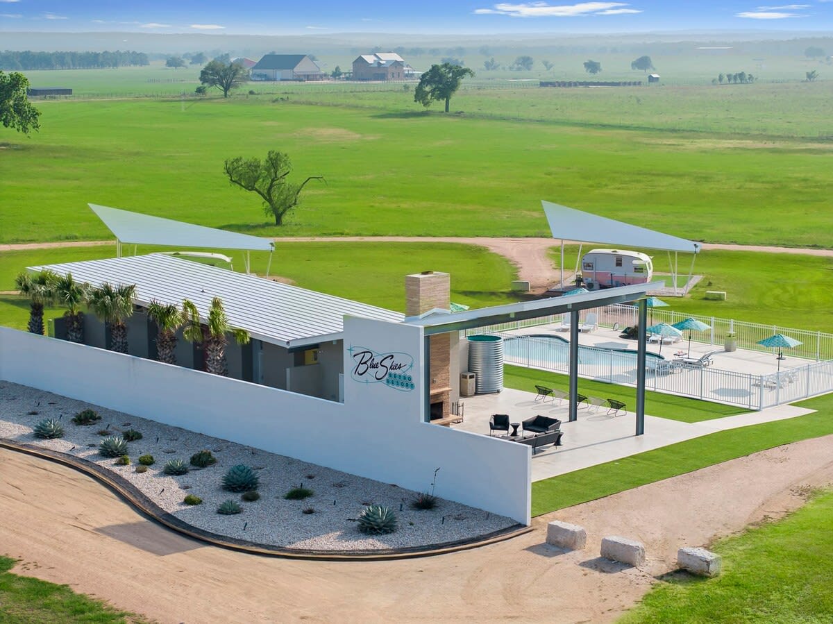 If you're a fan of glamping and in need of a Texas Hill Country getaway, look no further than Miss Estella in the Palm Springs-inspired Blue Skies Retro Resort! This reissued 1961 Shasta will take you back in time, providing you with access to amazing shared amenities that include an outdoor pool, a gas grill, and a pavilion with an outdoor fireplace. You'll have your very own separate bathroom suite, as well as a spacious outdoor shower where you can rinse off under the enormous Texas sky.