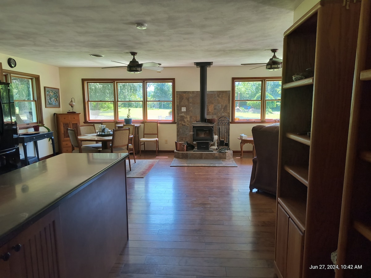 Exactly 9.6 miles from Peoria airport and exactly 14.6 miles to the Peoria Civic Center, this apartment is located in a quiet country area. This is an apartment in the Horsemeister stall barn. Private entrance, plenty of parking, This is a working horse farm with 2 stallions, mares and foals. Can sleep 4 adults comfortably but if you have a larger group you are welcome to bring airbeds. This is just 4 miles from the village of Hanna City. There is a sectional couch that can sleep 2 children.