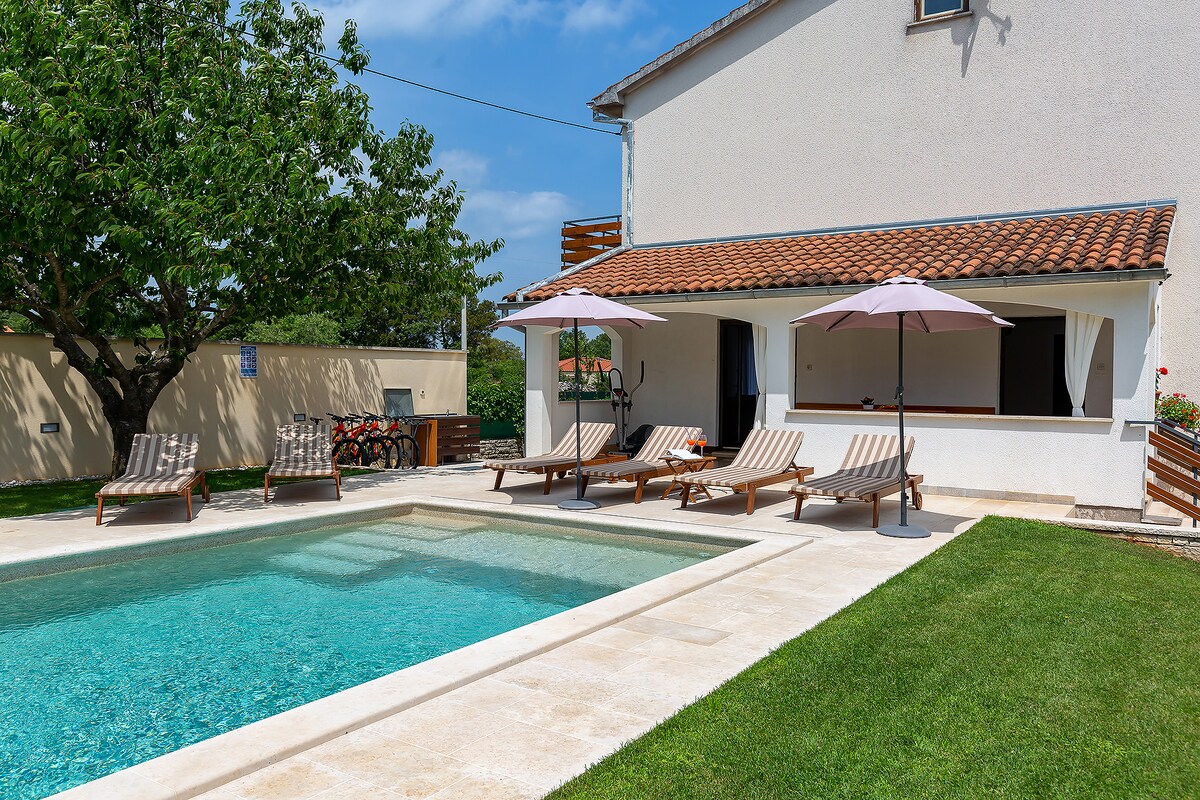 Նորաձև վիլլա Ռովինյի մոտակայքում՝ լուսանկարելու արժանի լողավազանով, ջակուզիով և սաունայով։ Արթնացեք հովիտի դեպի ծաղկուն, համայնապատկերային տեսարաններով։ Հարմար է զույգերի և ընտանիքների համար, մոտ է արկածային զբոսայգուն, Բրիյունի ազգային պարկին, դինոպարկին, միջնադարյան քաղաքներին և տեղական խոհանոցին։ Դա իսկական կանաչ փախուստ է բոլոր նրանց համար, ովքեր ցանկանում են վերադառնալ բնություն ՝ ժամանակակից կյանքի ամբողջ հարմարավետությամբ: Լիովին կահավորված է 2600 մ2 պարտեզում (ֆուտբոլ, արագության գնդակ, բադմինտոն և լողավազանի զվարճանք) խոհարարության և ժամանցի համար, որպեսզի ձեր երեխաները և սիրելիները վայելեն:
