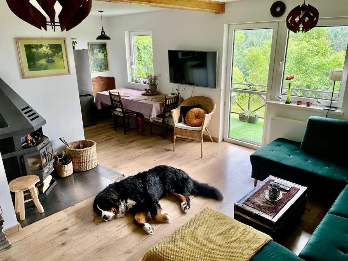 Unique cabin on the edge of the forest with a stunning view. Perfect for remote work: - 94 m², 2 floors - Balcony & terrace - 13-acre fenced property - 3 separate bedrooms - Bathroom + separate WC - Fireplace (unlimited free firewood) - Smart TV + 200+ channels - High-speed fiber optic internet - Just 1 hour from Kraków :) - Ideal for those who value peace and nature