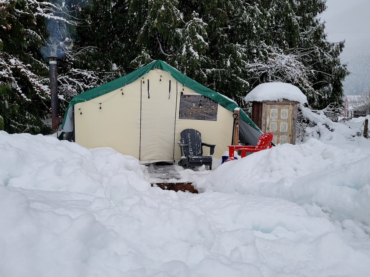 Ultimate Glamping Experience in a Canvas tent, on a hobby farm in the heart of Pemberton meadows. Our beautiful 2.5 acres property is surrounded by mountains and rivers. Soak up to the beautiful views of Face Mountain and Mount Currie while walking to the Beer Farmers! **This is for Self Reliant Adventurous Camping people who have great common sense and know how to start and maintain a wood stove as you will need it for both, warmth and cooking inside in the winter! (Wood and stove included)**