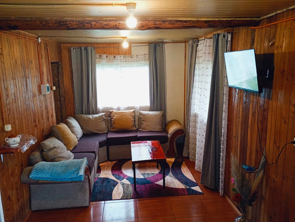 Beautiful Cabin in the Forest, located in the Lefún area between Villarrica and Pucón. It offers a stunning view of Villarrica Volcano, surrounded by native forest and birds. Every day you can hear Loicas and Chucaos. Fully equipped so you can enjoy your stay, disconnect, and relax. A lovely stream runs through the property. We recommend taking nighttime photos of Villarrica Volcano next to the wood stove with the panoramic view our cabin offers. We are sure you will love it!