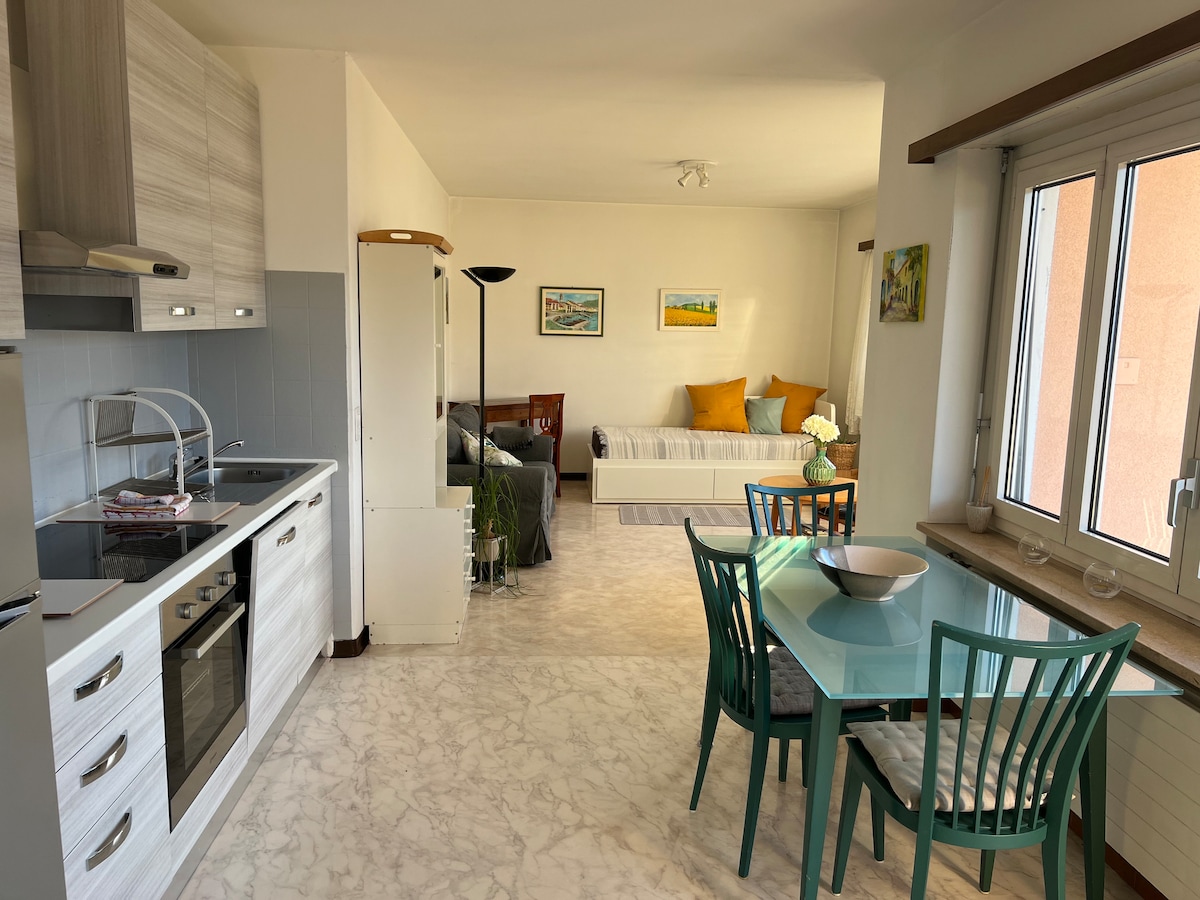 Studio with a magnificent view of Lake Maggiore and the surrounding mountains. It is located in a very quiet and convenient area for reaching Tenero, Locarno, the Verzasca valley and surroundings. Departure for mountain excursions directly from the house. The studio flat with private access is reached via a long staircase. Possibility to park the car in public parking spaces located about 15 minutes away. Bus stop reachable in 5 minutes. standing. Tenero station 20 min. standing.