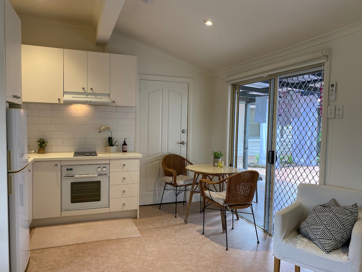 A self contained bungalow at rear of Victorian residence over looking pool designed for couples. Bedroom with king bed Is connected to living space in open plan format ie no door. Separate bathroom, kitchen living area. Pool available for guests to use but is shared with others. Free Wi- Fi. Please note ; a two night minimum stay applies. 2 dogs live at this property. We are dog friendly but within our terms and also additional cleaning fee of $50. Please add pet when booking.