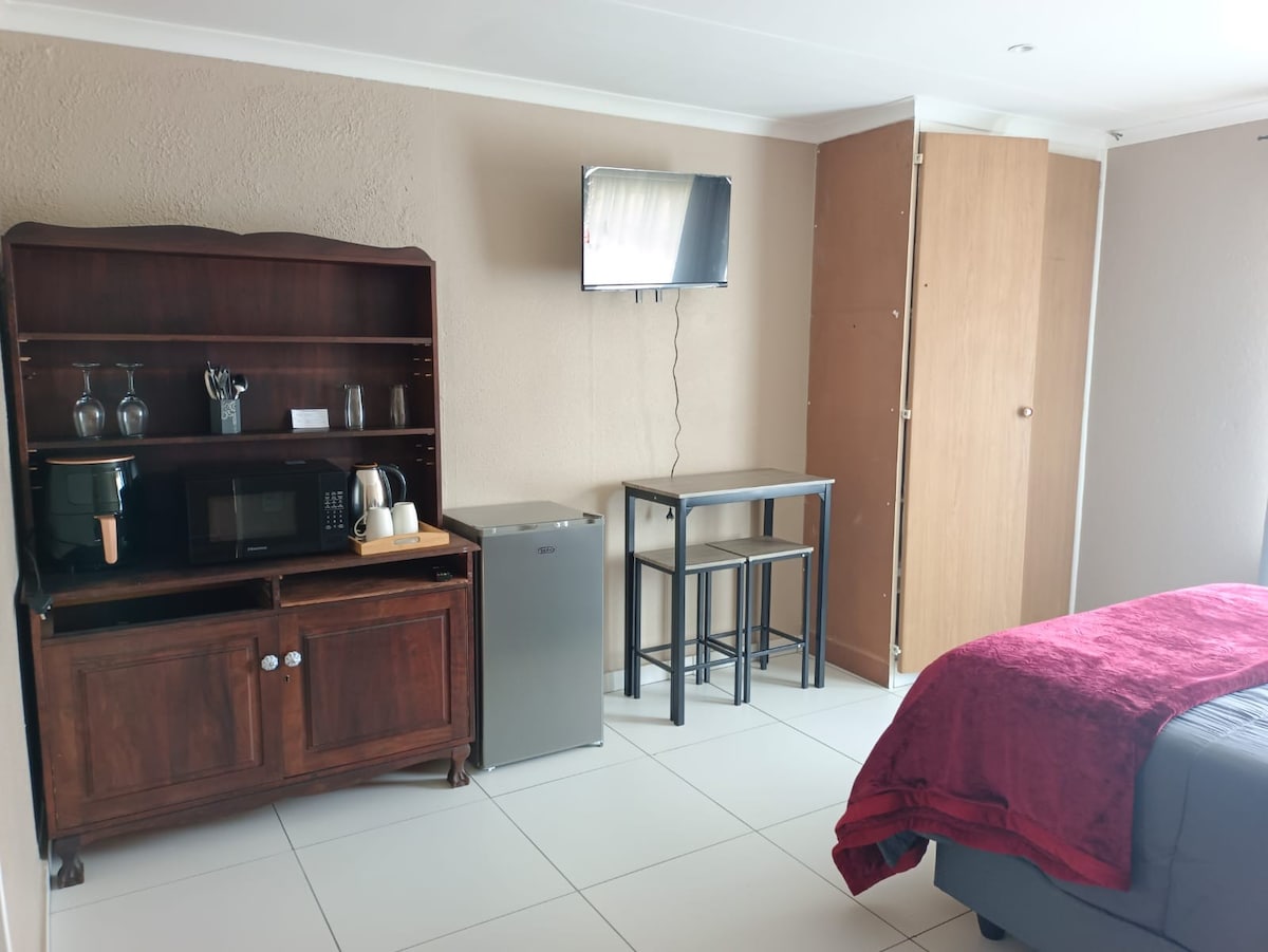 Experience Secunda at this modern, cosy and stylishly furnished studio apartment. Queen size bed ( two single beds can be arranged) , a fully equipped kitchenette with microwave, fridge and gas stove and all utensils. Private en-suite bathroom. Also comes equipped with uncapped WIFI, Netflix and DStv. It is within close proximity to most essential places of interest such as Secunda mall (street away), restaurants and Sasol Synfuels. A splendid environment for relaxation, work and getaway