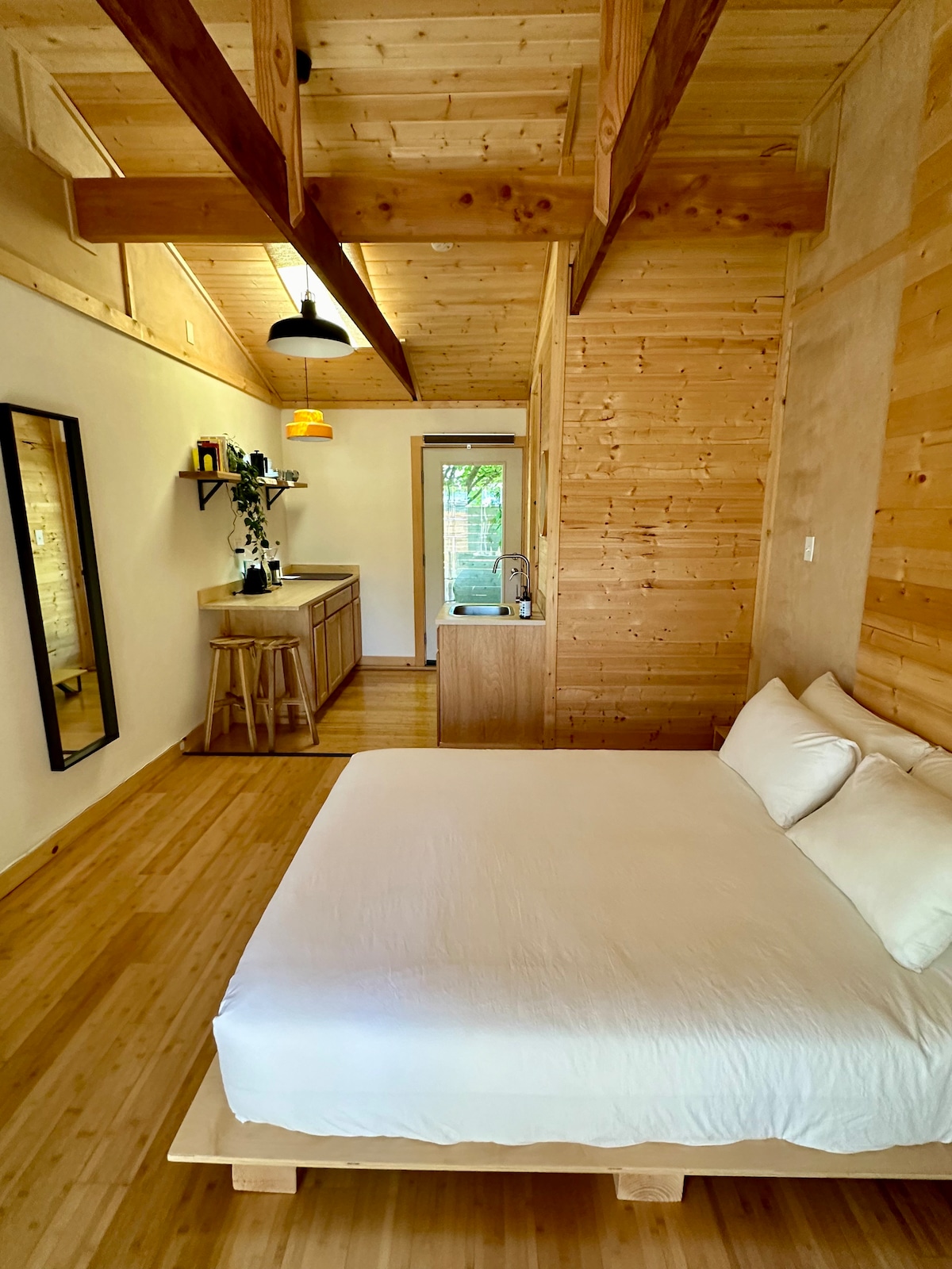 Newly built, stand alone modern home, beautiful and fully private for you alone! Designed and built by local, award winning architect! This cozy, quiet, relaxing escape has great access to the city. Just minutes to airport, 15 minutes to downtown and near two major freeways. Close to the action but just off the beaten path. Full amenities, Kitchen, dining, comfy queen memory foam mattress, washer/dryer, 45" smart TV with WIFI, AC/split unit, W/D, private, quiet, great workspace!