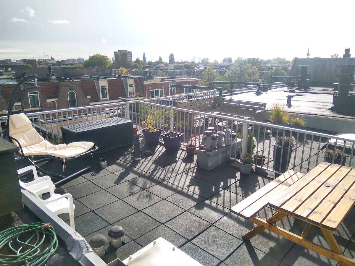 Cozy & extremely sunny apartment in OudWest, surrounded by shops, restaurants, supermarkets & just a few blocks away from Voldenpark. With 2 rooftop terraces and a 'dakhuis', you'll get the best outdoor spaces (heading South) in town. Full-equipped kitchen with oven, microwave & dishwasher. Bathroom with brandnew bathtub that has an area for shower (wide-rain style). Living room has a big sofabed and a projector. Bedroom features a 2-person sauna, wardrobe & an office chair/desk. Reliable WiFi.
