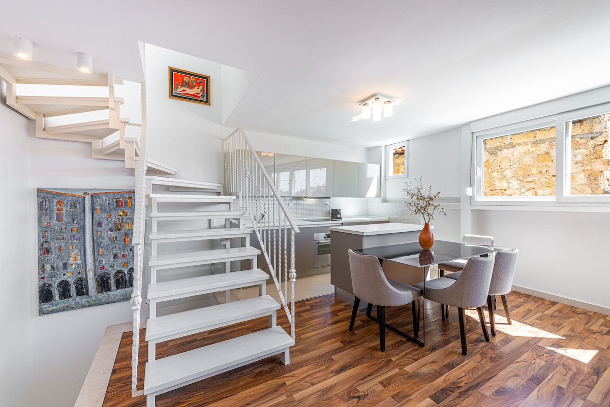 Comfortable and modern loft on perfect location, only few steps from the city walls and Ploče gate, with the most amazing views of the Old town, sea and the island of Lokrum. It consists of 2 double bedrooms, bathroom, toilet, fully equipped kitchen, office and specious dining and living room area with terrace overlooking magical roofs and Old port of Dubrovnik. Located just above the Old town in Ploče area, all major attractions and beaches are walking distance.