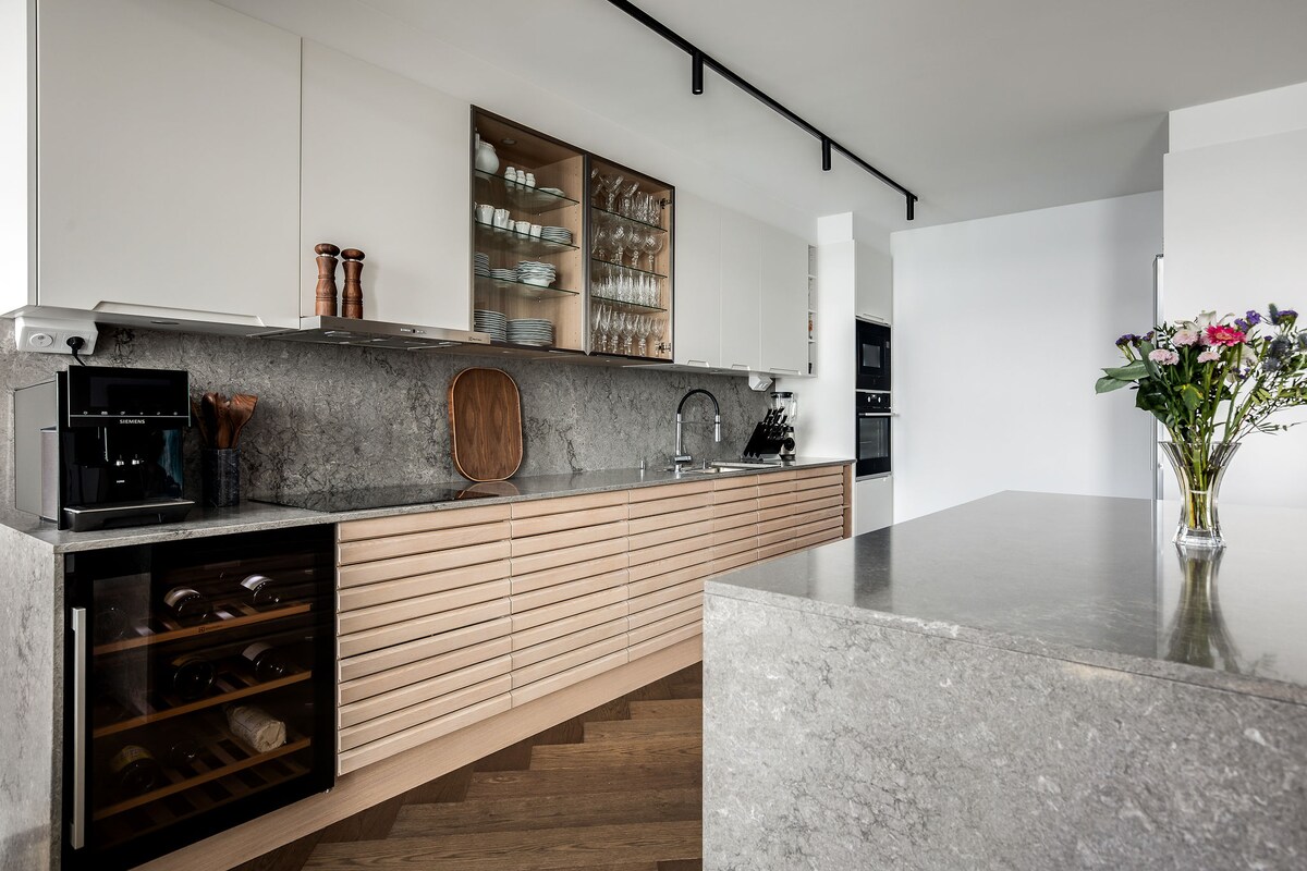 4 room 92 m2 apartment w/ 3 bedrooms w/ south facing balcony situated in harbor in the charming canal district. The magnificent views of both the canals and the harbor distinguishes it from other apartments. - 3 double beds in 3 seperate rooms - Subway 25 min to airport / 6 min to center - Suited for families/groups max. 6 persons. - Taxi to airport: One way is 30€ / 15 min - Parking 350m away - E-car: Charging is not an option - Notice: This is my private home with soul and personal stuff