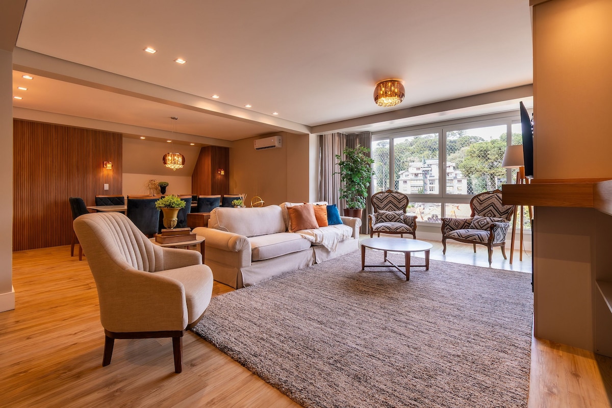 Fantástico e Luxuoso Apto Suíte, c/ quarto p/ casal, sala 2 ambientes e cozinha, todo mobiliado em alto padrão. Comporta 6 pessoas. Moderno, c/ todos os recursos disponíveis para tornar a estadia memorável, junto às mais lindas vistas da Serra Gaúcha. Muito verde, opções de lazer e conforto. Tem banheira de hidromassagem, iluminação ambiente, geladeira, cafeteira, micro-ondas, forno elétrico e d+ itens.