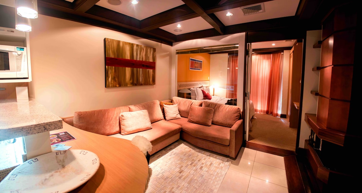 Բնակարան մինչև 5 հոգու համար, ննջասենյակ, լիովին կահավորված խոհանոց, հյուրասենյակ ՝ երկու սենյակով և բուխարիով ։ Այն ունի անվճար կաբելային հեռուստատեսություն և Wi - Fi ։ Համատիրությունն ունի տպավորիչ ենթակառուցվածք ՝ մարզասրահով, մանկական տարածքով, սաունայով, ջեռուցվող լողավազանով, սոլյարիով, բուխարիով տարածք, մինի շուկա 24 ժամվա ընթացքում, լվացքատուն և գեղեցիկ տեսարան դեպի Քարե տաճար ։ Եվ ամենակարևորը ՝ հյուրանոցային ամբողջական սպասարկում, շուրջօրյա ընդունարան և սենյակային սպասարկում, որպեսզի առանց անհանգստանալու վայելեք ձեր հանգիստը ։