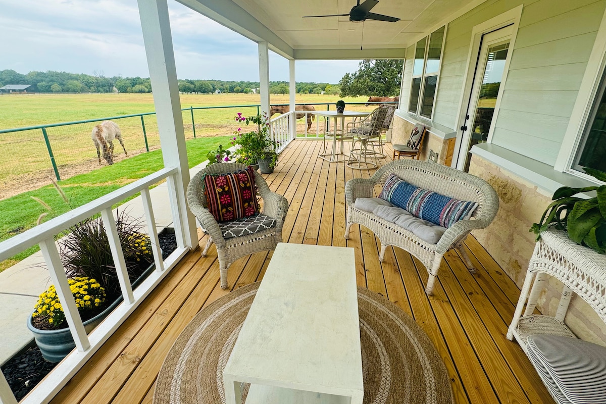 This charming little cottage is new construction, designed in the “industrial farmhouse chic” style. It’s the perfect place for a romantic getaway or a relaxing country adventure. Take in the wooded views from the screened-in back porch, walk down to the lake, or enjoy a day out in downtown Granbury! If you're lucky you may even see the neighborhood road runner. He loves to use our back porch as a hiding spot!We’d love to have you, so come stay a while.