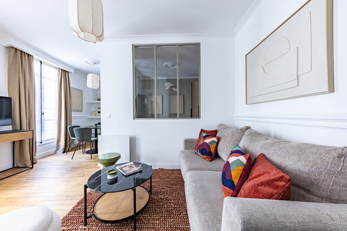 60 մ² մակերեսով, բարձրակարգ դասավորությամբ, օդորակվող բնակարան Փարիզի պատմական Մոնտորգեյ թաղամասի հենց կենտրոնում, որը հայտնի է իր սննդի խանութներով, փոքր բիստրոներով և ռեստորաններով։ Բնակարանը գտնվում է շատ հանգիստ փողոցի մի շենքի 1-ին հարկում։ Այն վերանորոգվել է 2023 թվականին հայտնի մի ճարտարապետի կողմից, ուստի շատ լավ է հարդարված և ունի շատ բարձրորակ հարմարություններ։ Դուք կլինեք հյուրանոցային սուիտում, որն ունի իրական փարիզյան կացարանի հմայքը։