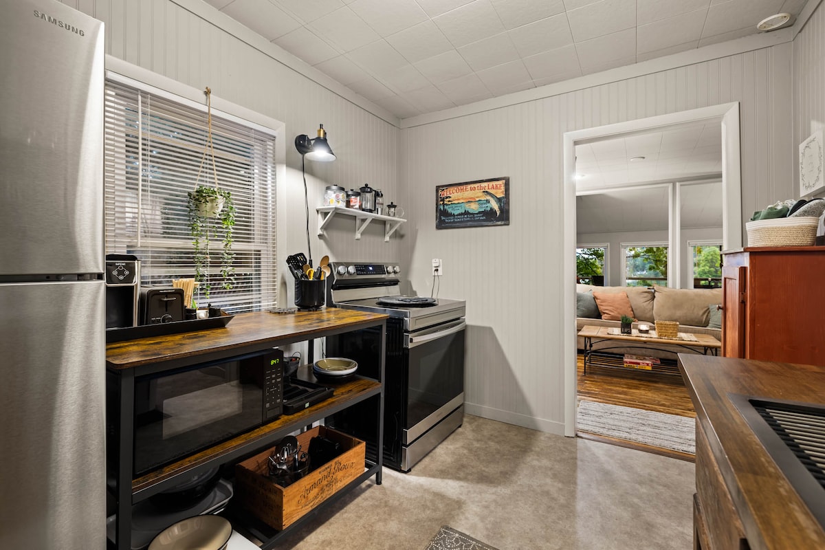 Բաց հայեցակարգային քոթեջ ՝ մեկ կամ երկու հոգու համար նախատեսված տարածք, որը գտնվում է Նյու Հարմոնի պատմական շրջանում ։ Անվճար կայանատեղի փողոցում, նիստերի դահլիճ և հարմարավետ երկտեղանի մահճակալ ։ Լվացքի մեքենա/չորանոց և փոքրիկ խոհանոցիկ (առանց սալօջախի կամ եփուկի )։ Ձեր հարմարության համար Wi - Fi և Smart TV: Բերեք ձեր Netflix կամ Hulu գաղտնաբառերը: Եղեք մեր հյուրը ձեր սեփական տարածքում: Հեշտ է առանց կոնտակտի ժամանում և մեկնում ։ Սուրճ/թեյի բար կամ Black Lodge Coffee *FYI - ի ստուգման ժամերը այն խանութների և ռեստորանների համար, որոնք նախատեսում եք այցելել: