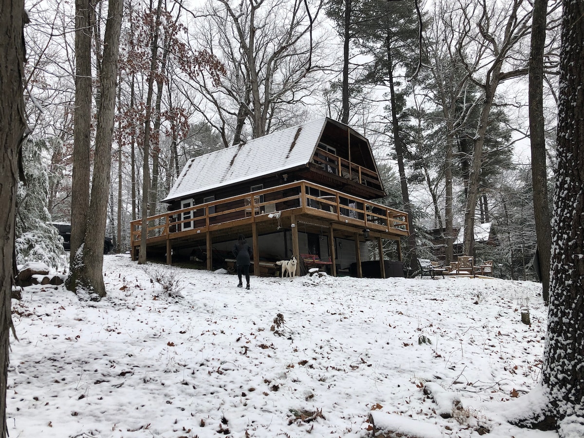 Get the most out of wild & wonderful West Virginia in this newly-renovated log cabin 20 minutes from downtown Berkeley Springs. Enjoy the wooded views from the expansive front porch, make s'mores around the stone fire pit, soak in the hot tub in the enclosed sun room, curl up with a book in front of the wood-fired stove, and get cozy in the movie theatre-like loft. You will have access to a private lake and incredible hiking trails minutes from the cabin.