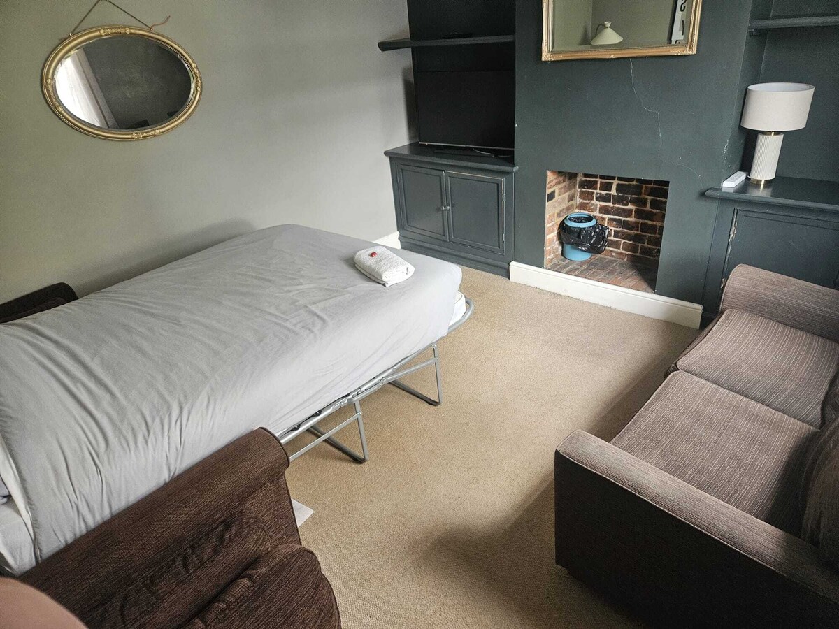 Compact grd. floor bedsit style 800 yds SHERINGHAM BEACH + DIY continental breakfast ..2 proper SINGLE beds one is STORED under the other for space ..privmini garden & entrance ..log burner - AIR con heat /cool.. tiny food prep area not a kitchen..microwave fridge etc…. en-suite bath + shower over…electric recliner sofa …sky tv ..Alexa ..max of two DOGS ..pls do book them .. live in hosts we are invisible but there if needed Brkfast diy ask for details..smoking strictly outside only..ty.