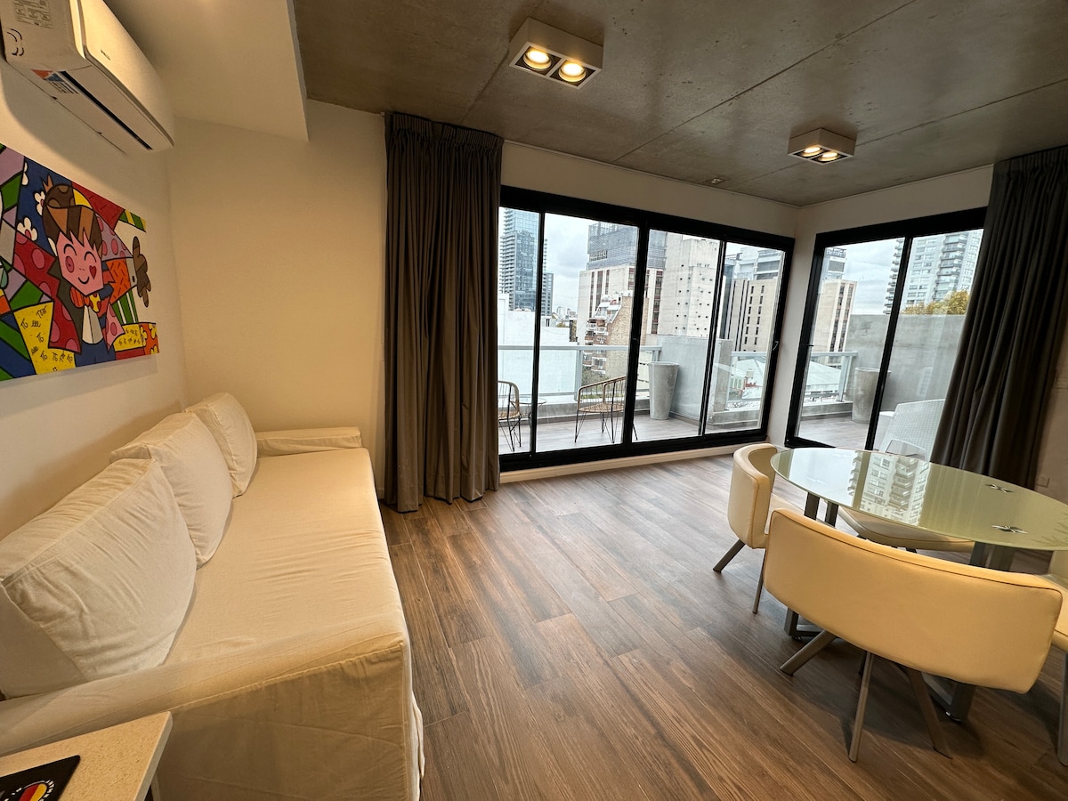 Վայելեք Պուերտո Մադերոյի բացառիկությունը ժամանակակից, հարմարավետ և լուսավոր ստուդիայում: Գտնվում է Բուենոս Այրեսի կենտրոնում ՝ շրջապատված զբոսայգիներով, ռեստորաններով և բարերով ։ Հանգստացեք պատշգամբից և տանիքից բացվող տեսարաններով կամ օգտվեք շքեղ հարմարություններից ՝ մարզասրահ, լողավազաններ, սաունա և սպա ցնցուղներ ։ Շուրջօրյա անվտանգությունն ապահովում է հանգստություն, իսկ փողոցային կայանատեղին իդեալական է մեքենա վարողների համար ։ Այն ամենը, ինչ անհրաժեշտ է կատարյալ այցի համար ։