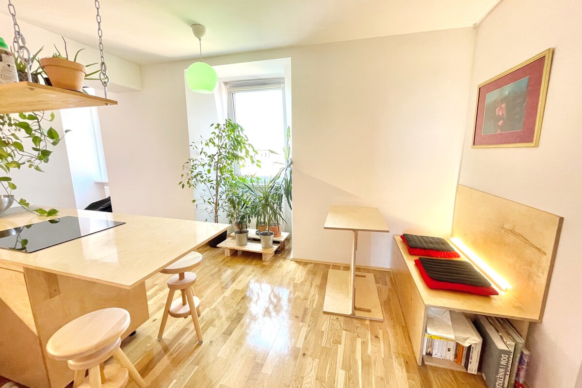 A 40sqm studio I built from scratch, mostly in wood, with a few smart home touches, a large projector screen and two workspaces. The view is unobstructed over the old roofs facing a calm but interesting and renewing area of Poznan. You will find everything you need within minutes’ walk including a farmer’s market, groceries, trams, cafes, MTP International Fairs Poznan. Quiet - I love the sound of the birds and the city view every day I spend there