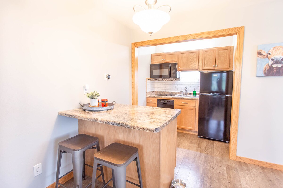 Welcome to my upper flat (private staircase to 2nd story) one block from Downtown New Glarus where you will find charming shops, tasty eats & activities! This unit can accommodate 4 people. There is a king sized bed & queen pull-out couch. Kitchen is fully stocked with a refrigerator, range/oven, toaster & coffee maker. Complete with cozy eat-in area! Living room has wall of windows & smart TV. W/D are included.