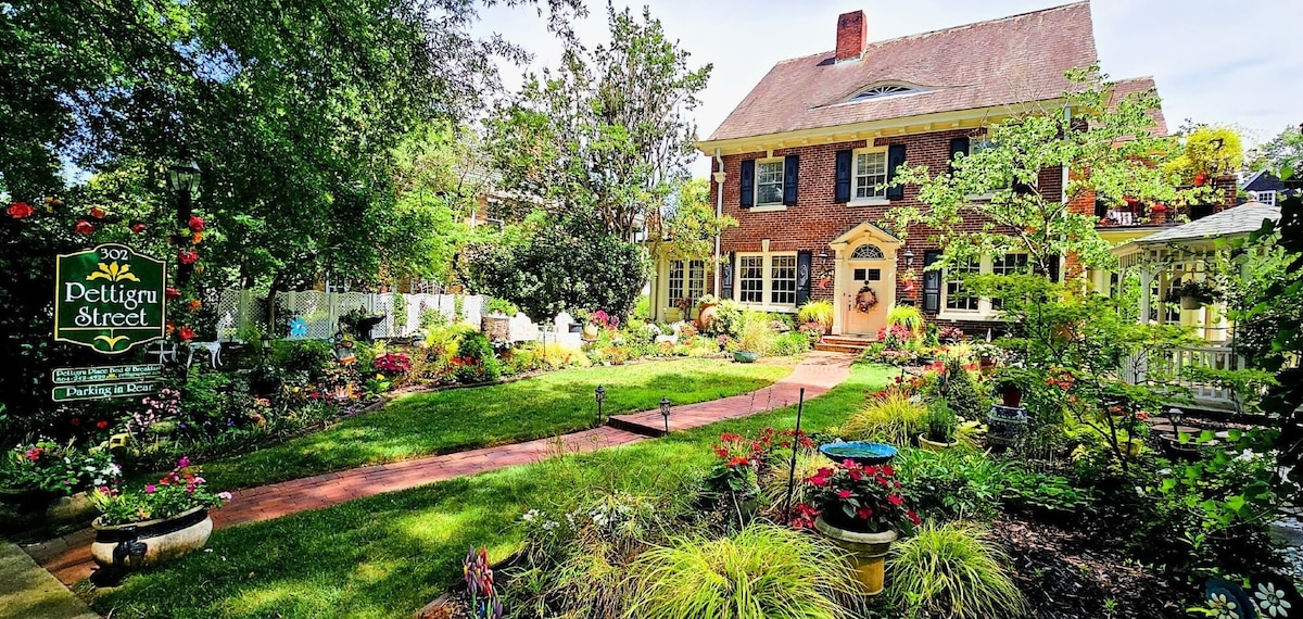 Nestled in the heart of downtown Greenville, South Carolina, Pettigru Place Bed & Breakfast is surrounded by the gracious homes of the Pettigru Historic District. Enjoy Southern hospitality at its finest within walking distance to Greenville's Main Street. This historic retreat features beautifully appointed common rooms, six luxurious guest rooms with private baths, and a blooming English garden providing a welcoming retreat just steps from our charming Main Street in Greenville. More than just typical hotel lodging, the inn will immediately make you feel right at home as the innkeeper greets you with a smile. Greenville's Award winning Main Street is a half a mile through the Pettigru Historic district from the bed and breakfast. Falls Park on the Reedy River, featuring the Liberty Bridge and waterfalls is located steps from Main Street. Enjoy the unique and eclectic offerings from Mast General Store, browse the latest fashions at Augusta Twenty, or splurge on something sweet from Kilwins Chocolate Shop or The Cream Shack. When you're ready for a break from shopping stop by Spill the Beans and try one of their many delicious ice cream flavors. Rent bikes for the day to experience the Swamp Rabbit Trail with access via Cleveland Park just 1/4 mile from the inn or at several points downtown. The beautiful, tree-lined Main Street area features shopping, dining at over 100 restaurants and several performing arts venues including the Bon Secours Wellness Arena, just one block from the inn. Downtown also boasts several galleries and museums. Allow our inn to be your retreat as you explore Greenville from the unmatched comfort and grace of a true Southern bed and breakfast. When your day's activities are done, return to the inn for a glass of wine and a plate of cheese and crackers as you relax in the garden in the Adirondack chairs, in one of our common areas, or your own beautiful room. Each morning, wake to the enticing aroma of a full gourmet breakfast such as Peaches and Cream French Toast. Two pieces of French bread griddled to golden, and topped with fresh SC Peaches, and a French vanilla caramel sauce served with crisp bacon or, indulge in Basil Eggs, a toasted croissant with sliced tomatoes, ham, and scrambled eggs topped with a parmesan basil cream sauce. We promise you won't leave hungry! If you are looking for outdoor adventure, Greenville is the doorway to the Blue Ridge Parkway and the Upstate area of South Carolina includes some of the most beautiful areas of the state for rest and recreation. You will find hiking and biking trails, minor league baseball, and golf all within 15 minutes of the house. Let us give you directions to one of the 20 waterfalls in the area. Or visit a state park and watch the eagles flying below you. Visit one of the area farms such as Happy Cow Creamery for a tour (and ask them why their cows are happier) or drop by one of our local microbreweries, Yee Haw Brewing Company or Fire Forge Brewery, and try one of their small batch creations. We are minutes away from Furman and Bob Jones Universities, as well as thirty miles to Clemson University. Pettigru Place Bed & Breakfast is the perfect place to begin your South Carolina adventure, and we look forward to welcoming you to Greenville!