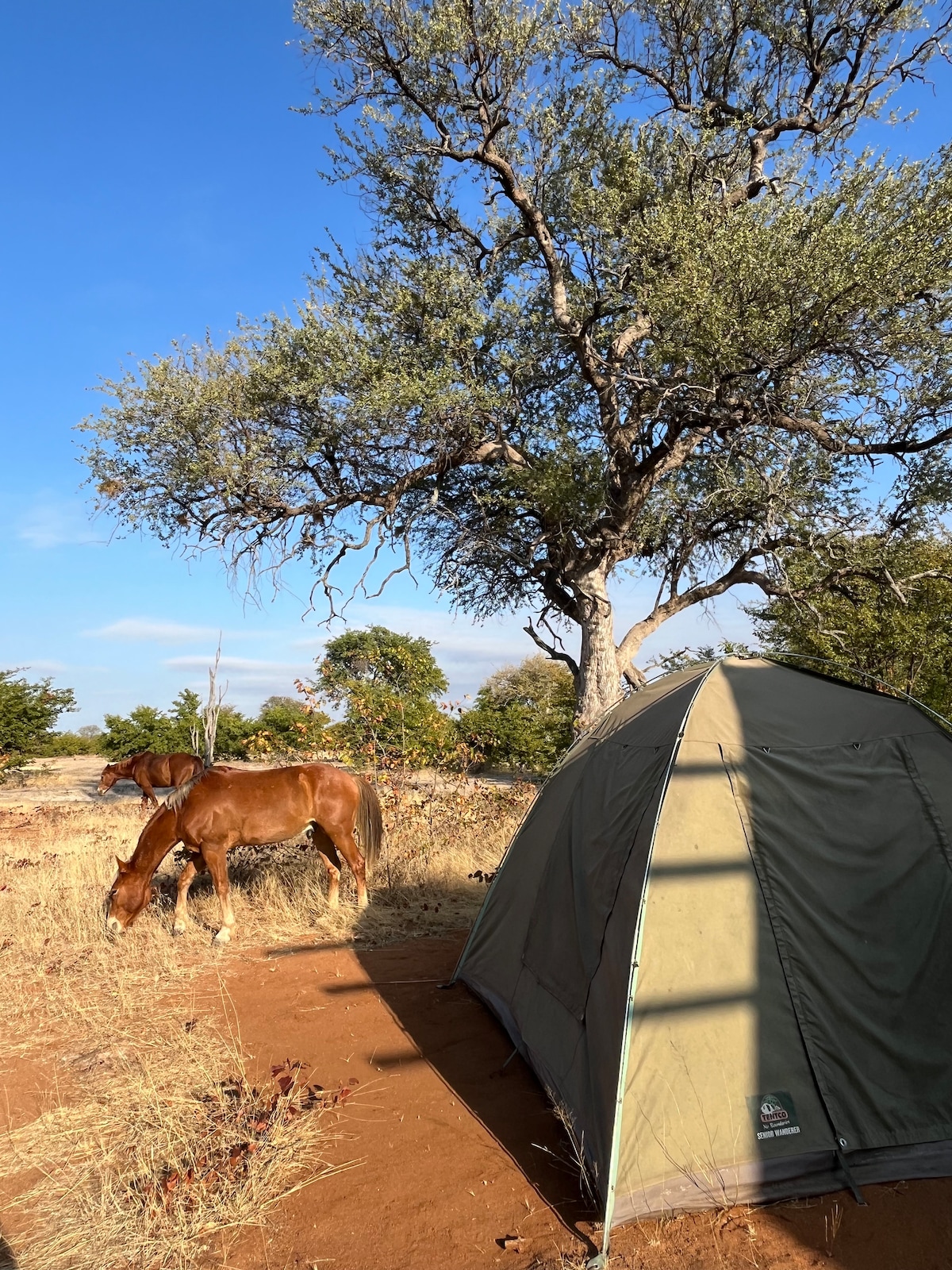 Welcome to the Bush Camp! The camp is rustic but comfortable, it consists of 2 tents (sleeping 2 each), one kitchen tent with fridge/freezer, stove etc., an outdoor shower and toilet, a fireplace and a Beduine "living room" tent. Our horses roam around the same camp as the camp and you may well get woken by a horses' snort or neigh admits the Hyena and other nightly sounds.