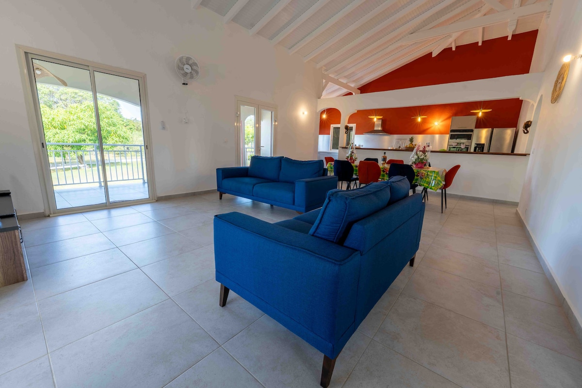 110մ² տուն ՝ Կարիբյան ծովի և Մոնսերատ կղզու գեղեցիկ տեսարաններով ։ Վիլլայի ներքևում գտնվող կացարանն ամբողջովին առանձին է և ունի 3 ննջասենյակ, որոնցից 2 - ը կարող են օգտվել մեծ լոգասենյակից ։ Երրորդ ննջասենյակն ունի առանձին լոգասենյակ ՝ մերսող լոգարանով ։ Բոլոր ննջասենյակներում կան մեծ երկտեղանի մահճակալներ, սմարթ 65"հեռուստացույց, օպտիկամանրաթելային ինտերնետ: Հյուրասենյակ ՝ խոհանոցով, որը բաց է դեպի կտուր Այցի ավարտից հետո մաքրման և ամենօրյա մաքրման ավարտը ներառված է գնի մեջ ։