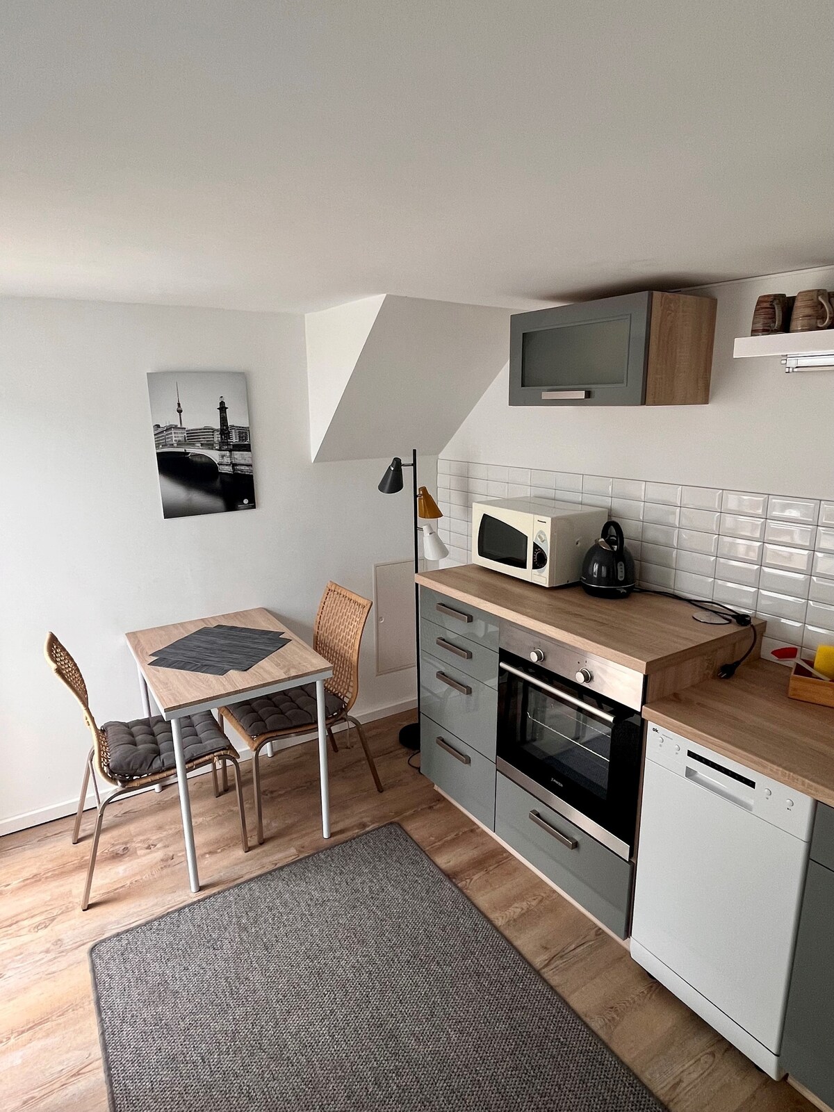 Brand-new one-bedroom apartment, tastefully furnished with private terrace. Close to amenities and public transport. Ideally located between Berlin and Potsdam. Bedroom with large double bed, comfy mattress, ample wardrobe space and access to your private secluded terrace. Living room with comfy L-shaped sofa, which converts to another double bed, TV and DVD player as well as eating space to seat four. Open-plan kitchen, well equipped with fridge/freezer, hob, oven and dishwasher.