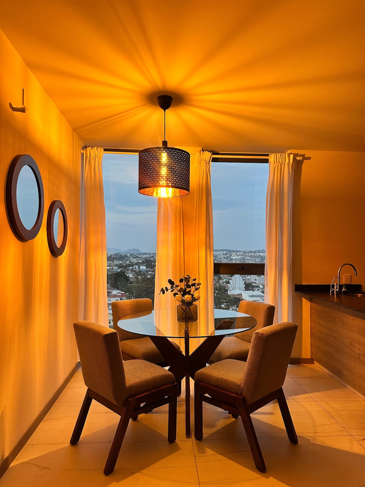 19 - րդ հարկում գտնվող լոֆթ ՝ համայնապատկերային տեսարանով ։ Հագեցած է օդորակիչով, լվացքի մեքենա - չորանոցով, տապակիչով և գերարագ ինտերնետով ։ Որակյալ, հարմարավետ և հյուրընկալ կահույք ։ Ծածկված կայանատեղի և շուրջօրյա անվտանգություն Գտնվում է Գվադալախարայի ամենաթեժ տարածքում, որտեղ կարող եք շրջել ոտքով, հեծանիվով, հասարակական տրանսպորտով կամ մեքենայով. մոտ է ռեստորաններին, բարերին, Էքսպոյին, հրապարակներին, զբոսայգիներին, անտառներին, քաղաքի կենտրոնին: Մենք հոգում ենք հիգիենայի, յուրաքանչյուր հյուրի միջև ախտահանման, մաքուր և անվտանգ տարածքի տրամադրման մասին