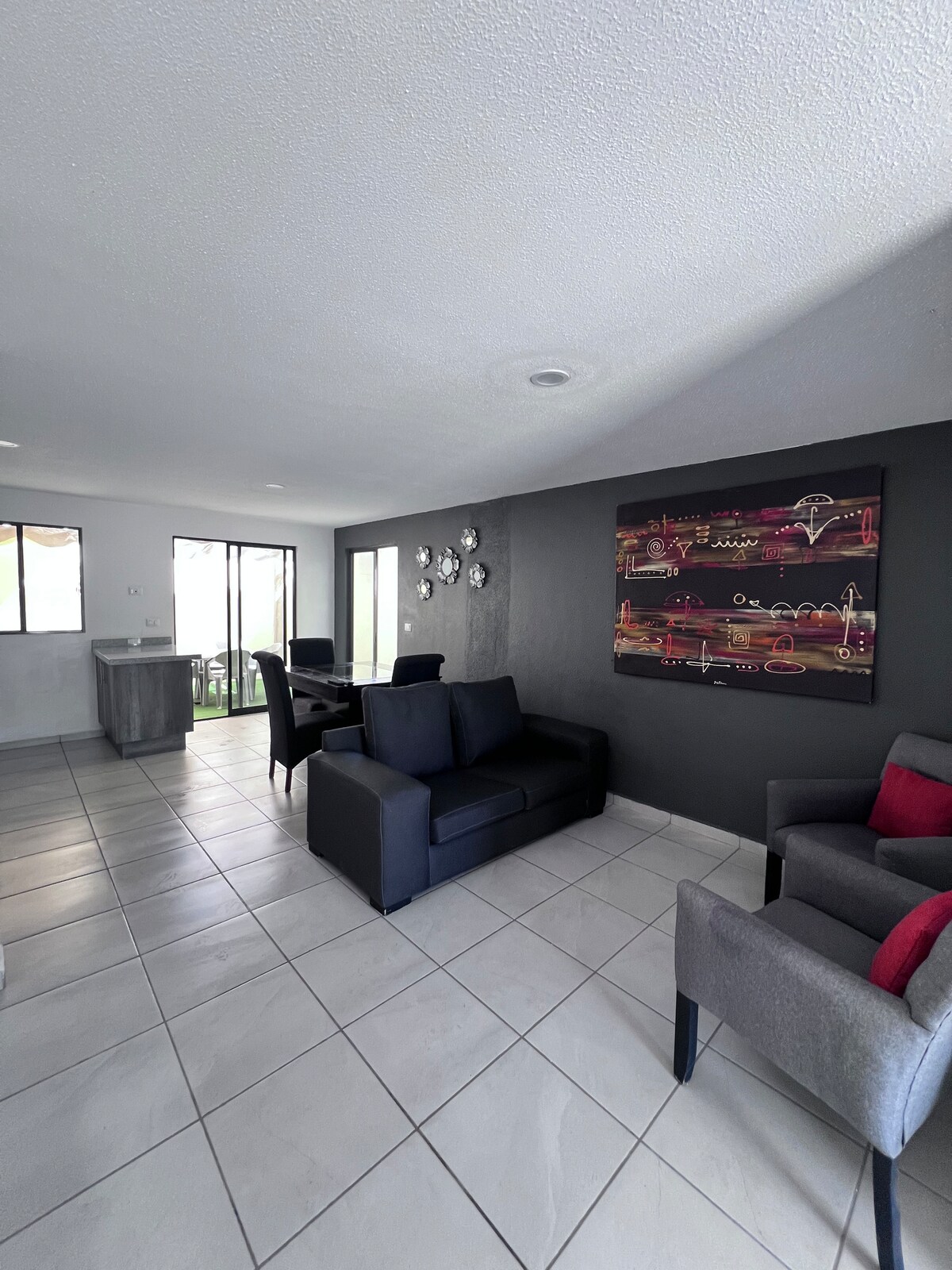 Departamento equipado Cocina: tetera para agua caliente, microondas, garrafon de agua ilimitada, refrigerador, estufa, licuadora, Utensilios de cocina, cubiertos, vasos, platos, sartenes Cuarto de lavado: lavadero, Tendedero, burro para planchar, plancha, escoba recogedor Comedor: 4 sillas opcional a 6 a usar las de los escritorios Baño completo: shampoo, jabón corporal, jabón de manos, toallas Sala de tv: sillon cómodo con portavasos, mesa de centro con juegos de mesa, smart tv con streamings