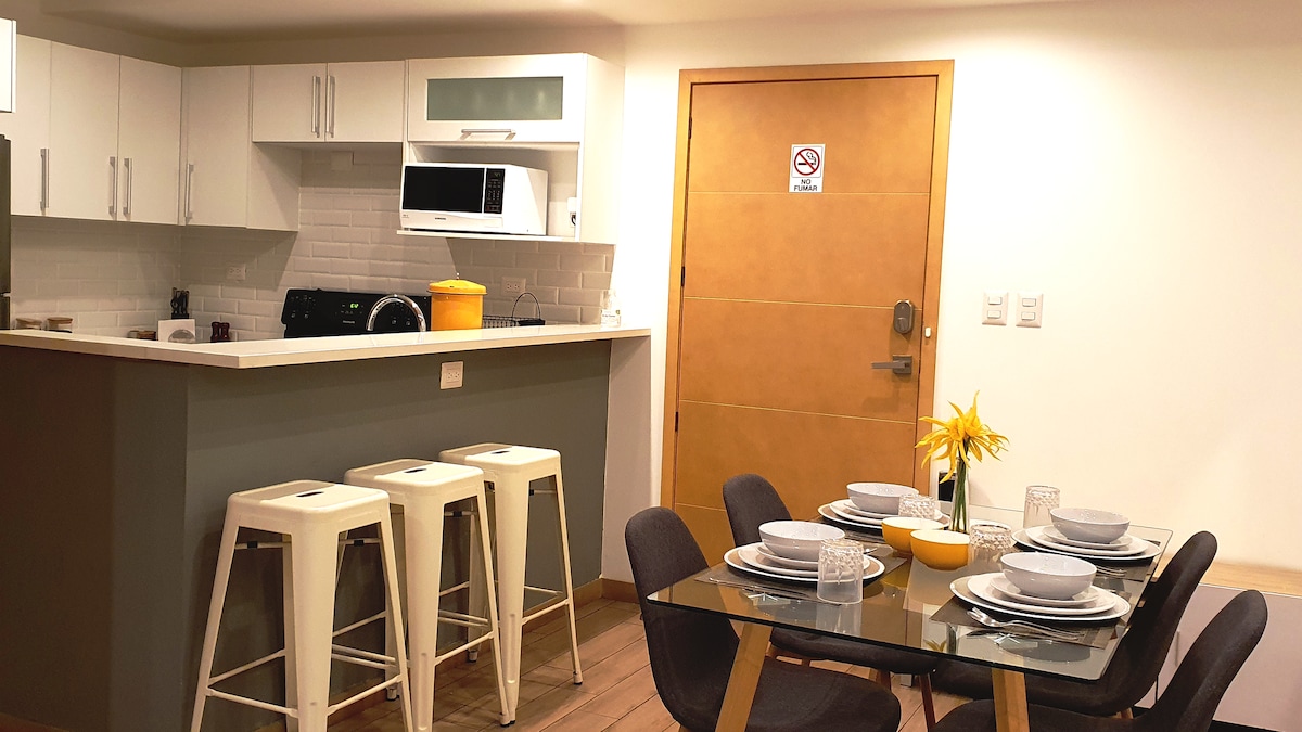 Բոլորովին նոր ժամանակակից բնակարան 4 - րդ գոտու սրտում, որը իդեալական է տեսարժան վայրերի կամ բիզնես ուղևորների համար ՝ մի շարք ռեստորաններ, սուրճի խանութներ, փաբեր և արվեստի պատկերասրահներ ՝ շրջելու համար: Հիմնական սենյակ ՝ երկտեղանի մահճակալով ։ Հյուրասենյակ ՝ Սմարթ հեռուստացույցով և լրացուցիչ քնելու համար նախատեսված բազմոցով ։ Հագեցած խոհանոց, 2 - ը 1 - ում լվացքի մեքենա/չորանոց: Անվճար ծառայություններ ՝ WiFi, ավտոկայանատեղի, 24ժ անվտանգություն: 5 րոպե հեռավորության վրա ՝ Torre del Reformador, Civic Center, National Theather, Centro Médico և այլ հիվանդանոցներ, Oakland Mall: