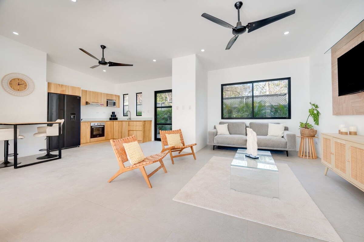 Nouvellement rénovée. Séjournez dans une superbe villa avec piscine à débordement privée, située dans une communauté sécurisée, proche des plus belles plages du Costa Rica. Entièrement rénovée en 2025, elle offre confort moderne et vue imprenable. • 2 chambres climatisées avec salles de bain privées • Espace ouvert avec cuisine équipée et salon cosy • Salle à manger extérieure pour admirer des couchers de soleil spectaculaires • Wi-Fi, alarme et parking clôturé