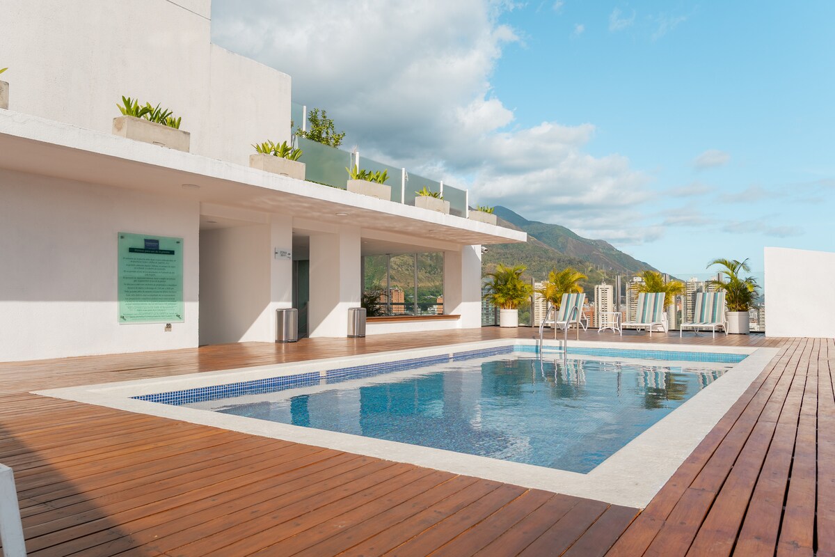 Disfruta una estadía cómoda y elegante en este moderno apartamento, totalmente equipado, ideal para viajeros ejecutivos, parejas o huéspedes que buscan confort, seguridad y excelente ubicación. El espacio cuenta con acabados de alto nivel, iluminación moderna, áreas integradas tipo hotel, espectaculares areas verdes, piscina climatizada, jacuzzi, terraza y una increíble vista panorámica 360° a la ciudad y la montaña.