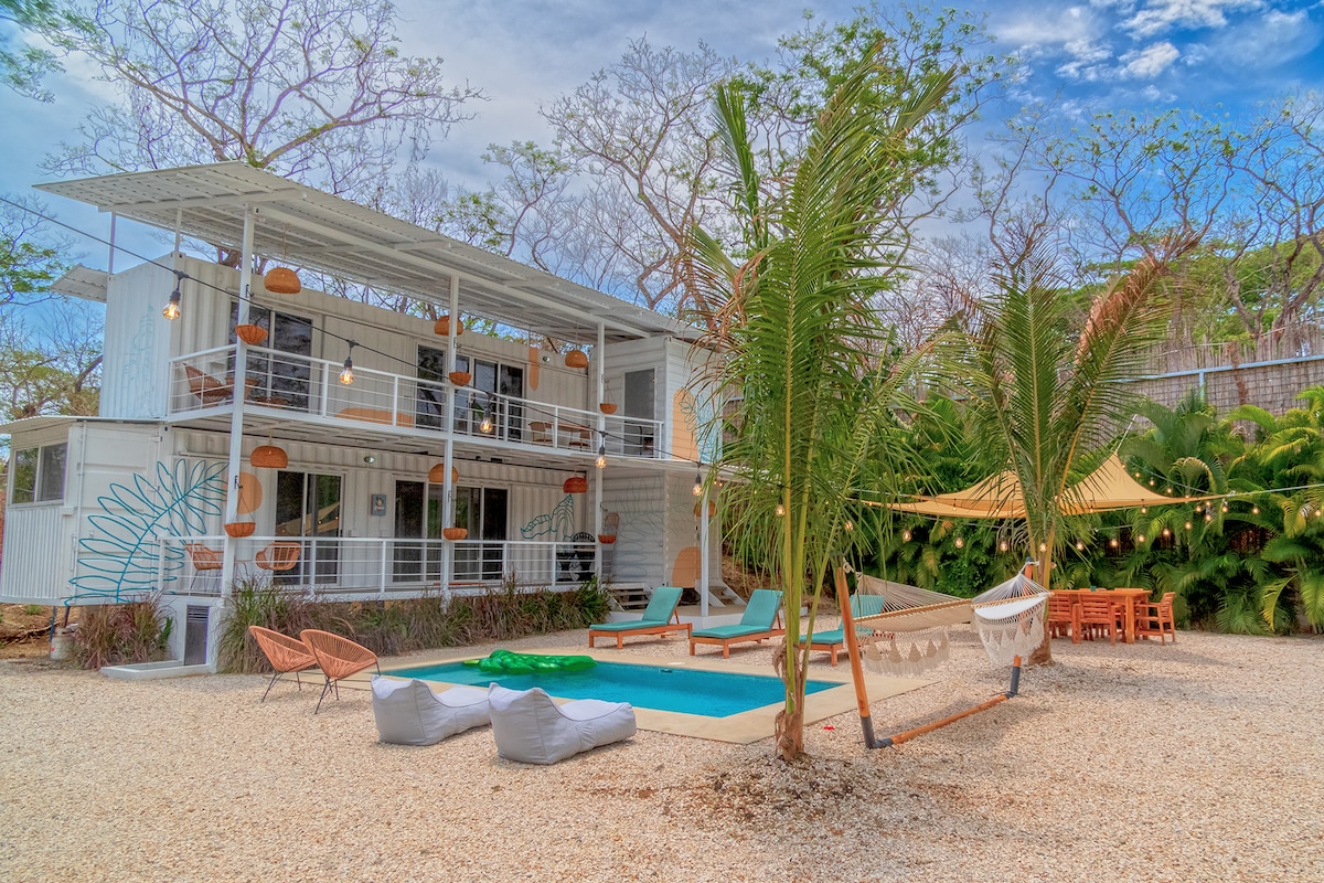 Արդյունաբերական և ժամանակակից կոնտեյներային տուն ՝ հսկայական տախտակամածով և ջակուզիով, որը գտնվում է Կոստա Ռիկայի ջունգլիների մեջտեղում, գեղեցիկ և մեկուսի Barco Quebrado Beach - ից 5 րոպե հեռավորության վրա և անմիջապես սերֆինգի և յոգուիի համաշխարհային կարգի Սամարայի և Նոսարայի միջև ։ Հիանալի է թվային քոչվորների և ջունգլիներում հանգստանալ ցանկացողների համար․ վայելեք գերարագ ինտերնետ, օդորակիչ, տաք ջուր և ամբողջական խոհանոց հեռավոր վայրում, որտեղ ձեզ կհետևեն կապիկներ և վայրի կատուներ։