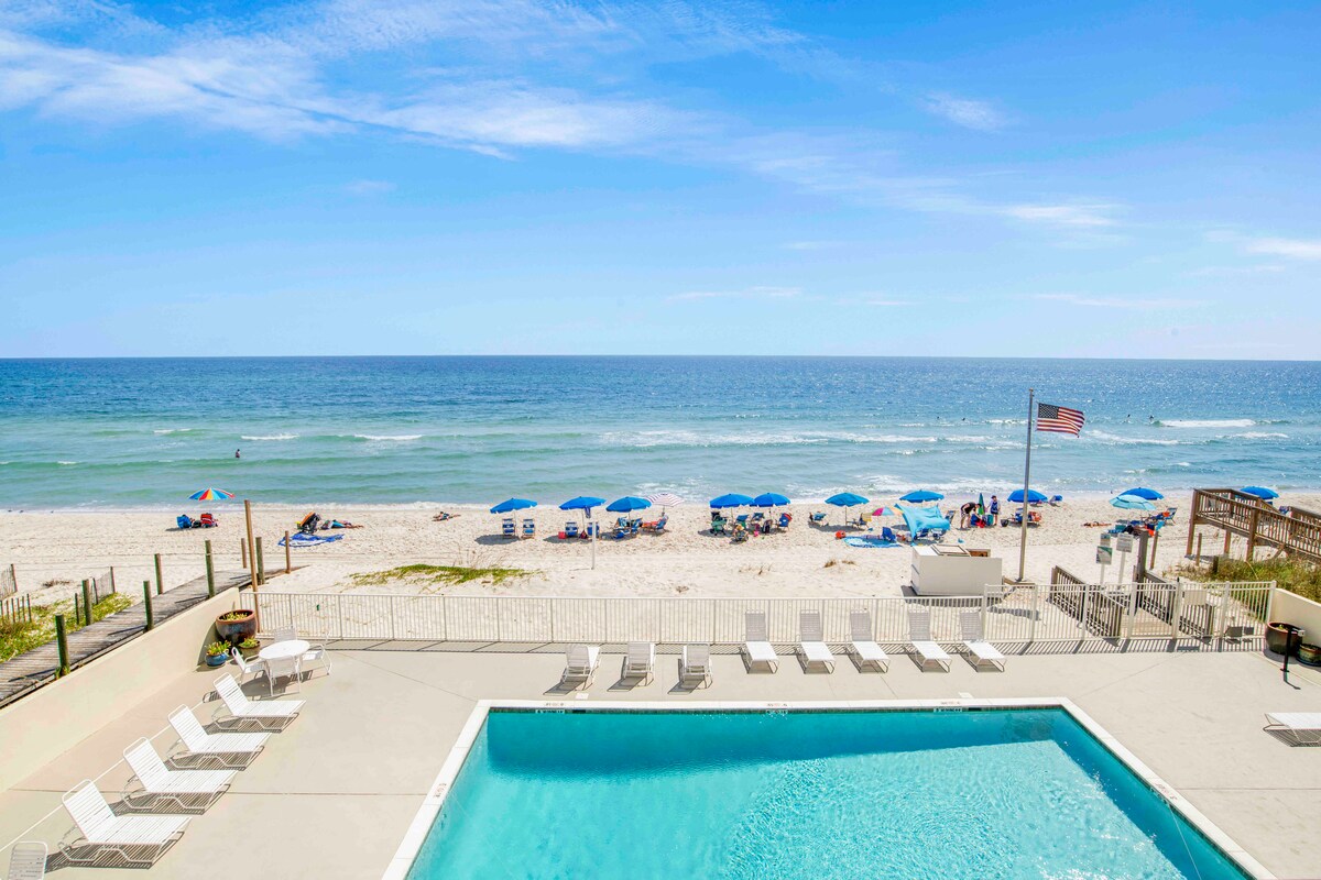 In the heart of Gulf Shores is this DIRECT beachfront condo with great views in every direction of the sugar white beaches & emerald waters. From the balcony you can watch the majestic sun rise & the sunset or marvel at the dolphins playing. Directly to the East is the public beach with many amenities for the whole family including restaurants, shopping & a playground. After a fun day prepare to make dinner in the well appointed kitchen, relax with the cheerful decor & comfortable sitting.
