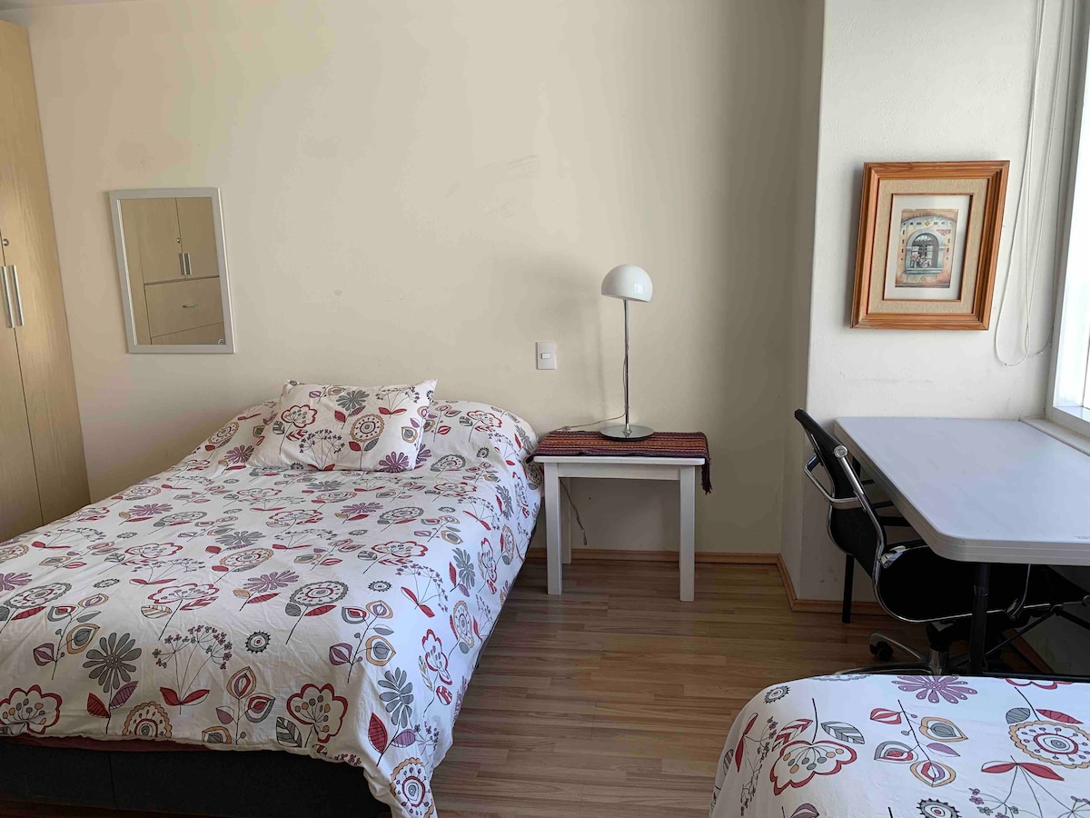 Ամբողջական բնակարան ՝ մեծ մահճակալով, լոգասենյակով և անլար Wi - Fi - ով ։ Գեղեցիկ տեսարան դեպի Սանտա Ֆե, ճաշասենյակ, խոհանոց, միկրոալիքային վառարան, սառնարան, լվացքի մեքենա, արդուկ։ Ավտոտնակ՝ ուղղակի վերելակներով։ շուրջօրյա անվտանգություն և հսկողություն, մարզասրահ Այստեղ ձեզ կզգաք ինչպես տանը ՝ շատ հարմարավետ վայր, որտեղ կգտնեք այն ամենը, ինչ անհրաժեշտ է ձեր այցի համար ։ Մինի սուպերմարկետ PB-ում, 2 միջազգային ռեստորան և մեքսիկական։ Սանտա Ֆեի կողքին, շատ մոտ է Interlimas-ին, առևտրի կենտրոններին, Ibero-ին, Tec-ին, տարբեր մուտքային ճանապարհներին։