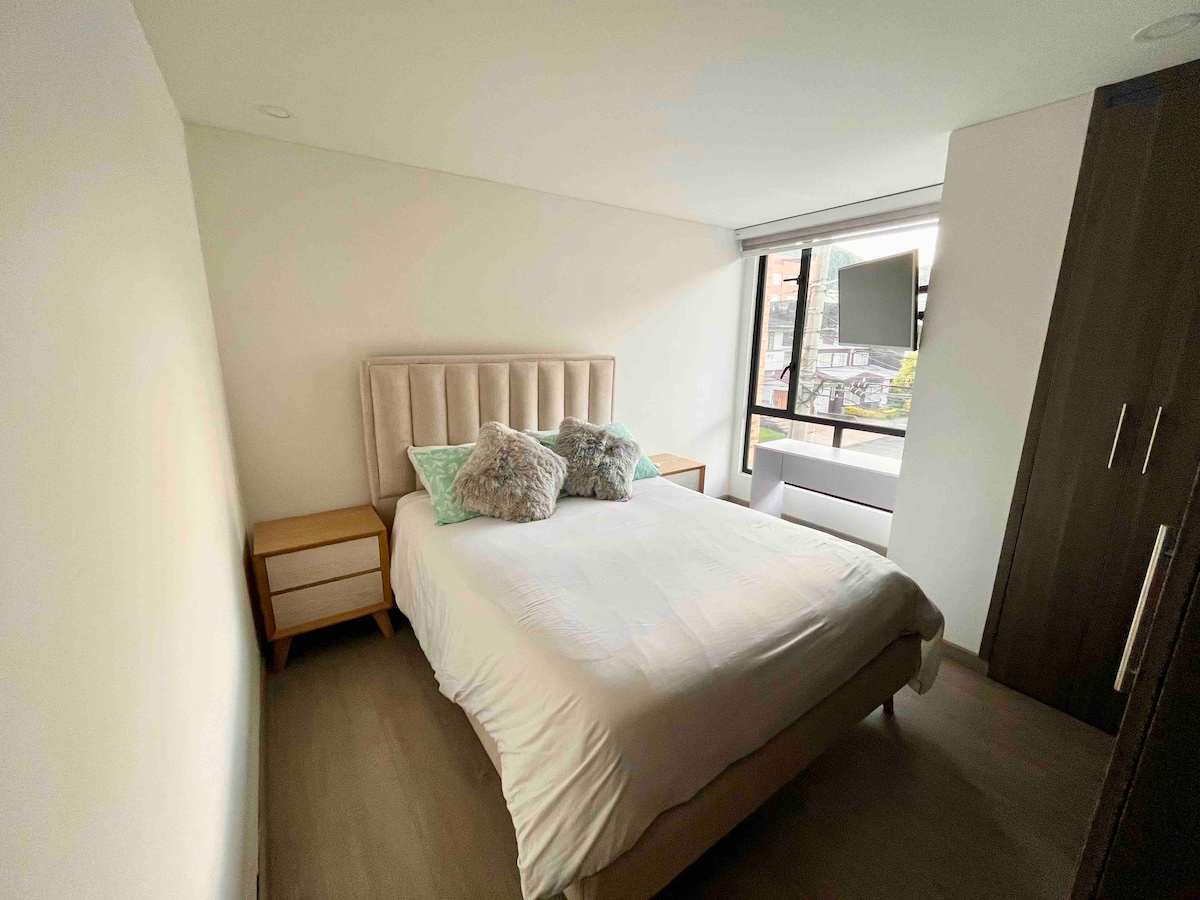 Hermoso apartamento en Santa Bárbara Nororiental, tiene un dormitorio de cama doble, tv, closet y baño. Sala con baño auxiliar, cocina completamente dotada/ barra/comedor. El edificio tiene una terraza donde se puede disfrutar de una vista maravillosa a los cerros orientales y abajo cuenta con un cuarto de ropas. Es un espacio ideal para pasar una temporada en Bogotá,cerca a un barrio típico donde hay restaurantes de alto gourmet, Clínicas y hospitales reconocidos y a dos famosos mall shopping