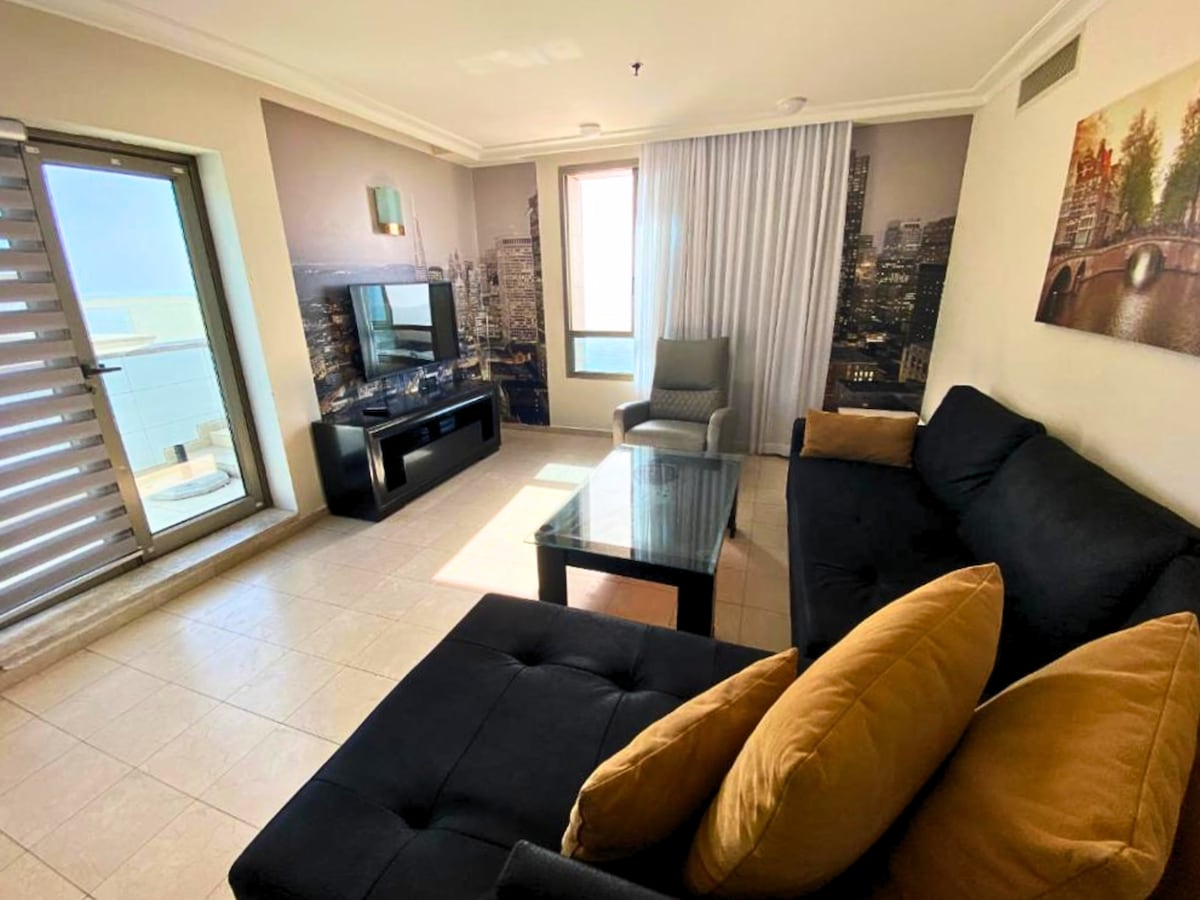 2 սենյականոց բնակարան (4 - րդ հարկ )՝ Հայֆայի համայնապատկերով, կենտրոնական կահավորված լողափի մոտ ✅ Հյուրասենյակում կա ծալվող բազմոց, ճաշասենյակ, ՍՄԱՐԹ հեռուստացույց, Wi - Fi, հեռուստացույցի տակդիր և սուրճի սեղաններ ։ ✅ Ննջասենյակում կա երկտեղանի մահճակալ, մահճակալի կողքի սեղաններ և մեծ ներկառուցված զգեստապահարան ։ Լոգասենյակը ✅ համակցված է լոգարանի հետ ։ ✅ Բնակարանն ամբողջությամբ հագեցած է կերակուր պատրաստելու և ճաշելու համար անհրաժեշտ ամեն ինչով, այդ թվում ՝ լվացքի մեքենայով, ջեռոցով, միկրոալիքային վառարանով և գազօջախով ։ Տրանսպորտի ✅ գերազանց հասանելիություն