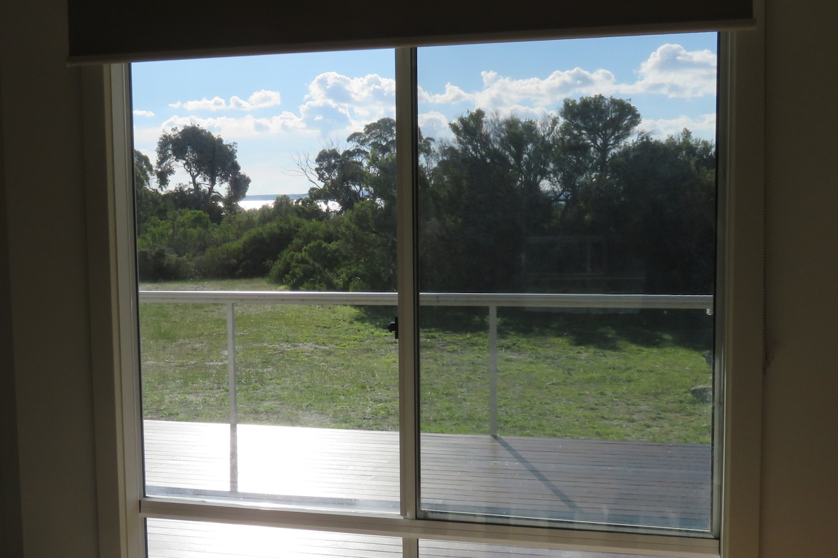 Saltwater is a purpose-built holiday house located on 20 ha (50 acres) of bushland overlooking the tranquil waters of Pelican Lagoon. Completed in 2019, the house is light-filled and airy, with north-facing windows and deck capturing the winter sun and wonderful views of the lagoon and surrounding bush. The house is simply but tastefully decorated with bamboo flooring, comfortable furnishings and beds, a well equipped kitchen and spacious living area. The nearest neighbors are 1 km away.
