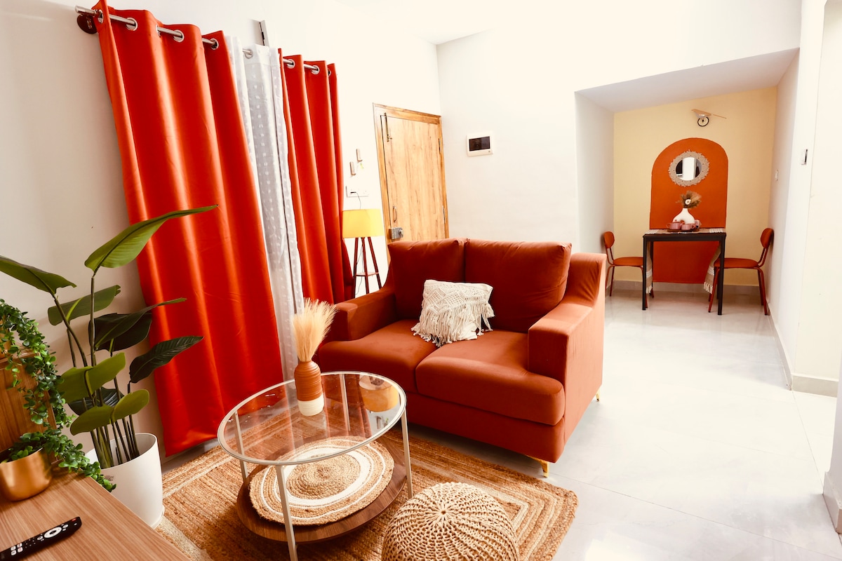 Զգացեք ֆրանսիական պրովանսալային ոգեշնչված ճամփեզրի բնակարանի հմայքը, որը հիանալիորեն գտնվում է Բանգալորի սրտում գտնվող Ինդիրանագարի աշխույժ 100 ֆուտ ճանապարհի վրա ։ Քարե հատակով, բարձր ճառագայթներով առաստաղներով և հնաոճ նրբագեղ մանրուքներով այս գեղեցիկ դիզայնով տարածքը վայելում է շքեղությունն ու ջերմությունը ։ Հանգստանալիս վայելեք բնական լույսը կամ դուրս եկեք ՝ ուսումնասիրելու աղմկոտ թաղամասը ։ Մի փոքր հեռու կգտնեք մի շարք խանութներ, սրճարաններ և ռեստորաններ ՝ առաջարկելով առավելագույն հարմարավետություն ձեր այցի համար