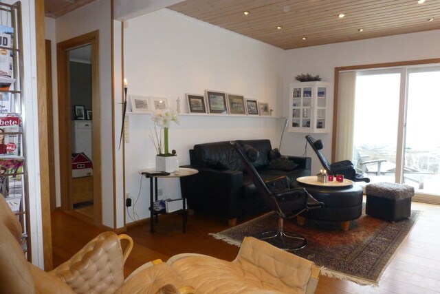 One bedroom downstairs w double bed and new added attic bedroom with one double bed and one bed that also functions as a sofa. Outdoor space with unobstructed sea view and outdoor furniture. From the apartment you can view the sea and walk about 100 meters down to the ocean. 5 minutes away walking by the ocean you get the beautiful sandy beach of Ranarpsstrand, which also hosts a tennis field and a pool.