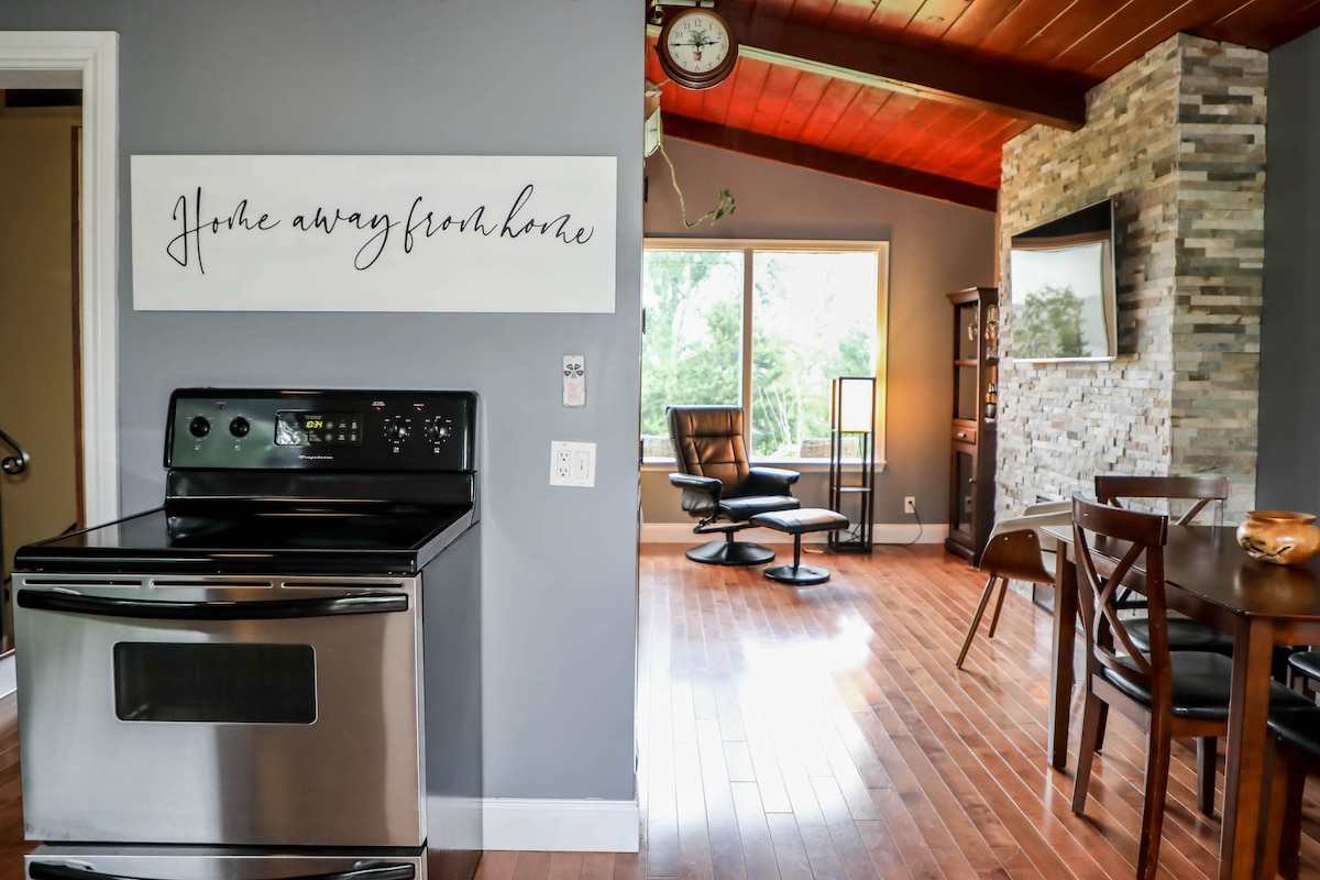 Ե ՛ վ քաղաքի կենտրոնից, և ՛ կենտրոնից ընդամենը 5 րոպե հեռավորության վրա գտնվող այս լավ խնամված 4 սենյականոց տունը շատ բան ունի առաջարկելու ։ Մի մեծ, treed, մասնավոր ավտոկայանատեղի, դա «Երկիր է քաղաքում ».Վերազանցված փայտյա առաստաղներ, ընդարձակ ննջասենյակներ, լիարժեք բաղնիք, հսկայական բակ եւ ֆունկցիոնալ խոհանոց. Հանգստացնող հյուրասենյակ ՝ 55" 4K Smart TV - ով (Netflix - ով) և քարե էլեկտրական բուխարիով: Հեռուստացույցը նաև վարպետի մոտ: Մեծ տախտակամած շրջակա միջավայրի լուսավորությամբ ՝ բակը և կրակարանը վայելելու համար ։ Կայանատեղեր և գետի տեսարան ։ Բերեք ձեր մորթե ընկերոջը: