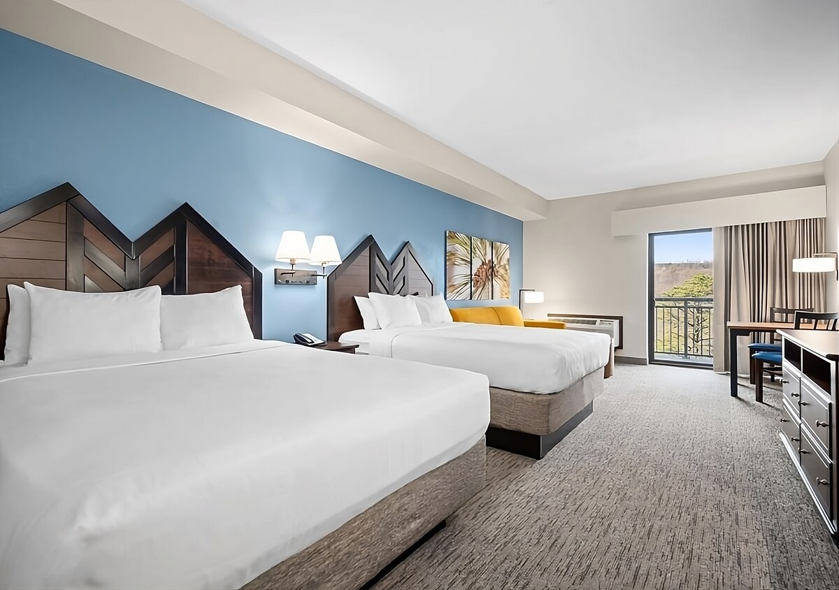 The resort is located in the iconic Pocono Mountains of Pennsylvania, offering a wealth of outdoor recreation for nature lovers. The historic town of Jim Thorpe is only a few miles away, with its picturesque streets and landmarks, including the Lehigh Gorge Scenic Railway. For a peaceful stroll, visitors can take a walk through the Delaware Water Gap National Recreation Area, or Hickory Run, Promised Land, and Big Pocono. Head to the Camelback Mountain Adventure Park for an exciting family fun!