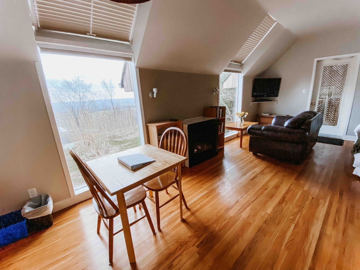 Enjoy panoramic views of Georgian Bay from this charming modern cottage on Paynter's Bay. Only eight minutes from Owen Sound, our cottage also borders on the quiet and beautiful Hibou Conservation Area where you can enjoy birding, hikes in forest and shoreline, and a great sandy beach and modern playground for the kids. Cuddle up next to the gorgeous modern Morso woodstove. Adventure awaits you with lots of skiing, biking, snowmobiling and the waterfall wonders of the Niagara Escarpment nearby.
