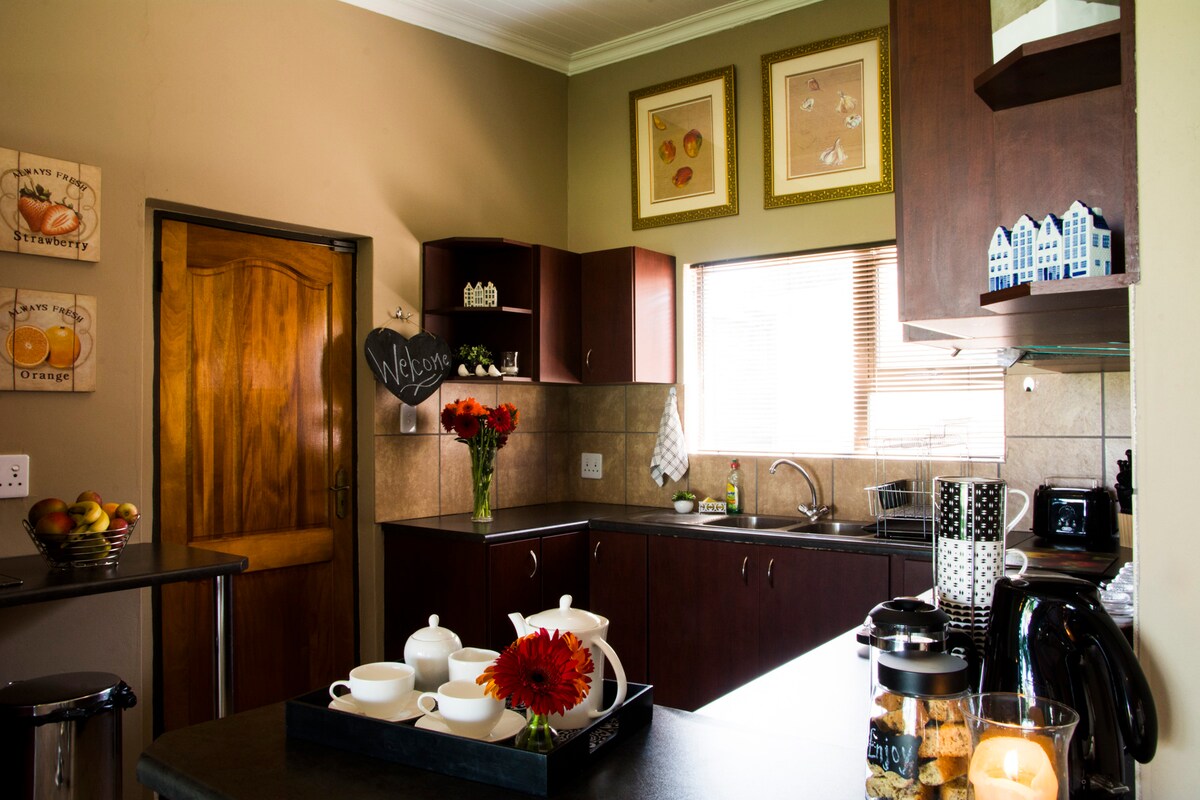 Baobab Self-Catering Suite can accommodate 2 people. Discover tranquility in our Baobab Suite, perfect for any traveller. Enjoy a private entrance, open-plan living area, full kitchen, workstation, and free WiFi. Unwind in the modern bedroom with a queen size bed and en-suite bathroom. The suite boasts views of lush gardens and a beautiful pool. Includes free parking and a Smart TV. Close to attractions, dining, nature reserves, and shopping. Ideal for relaxation or a productive stay.